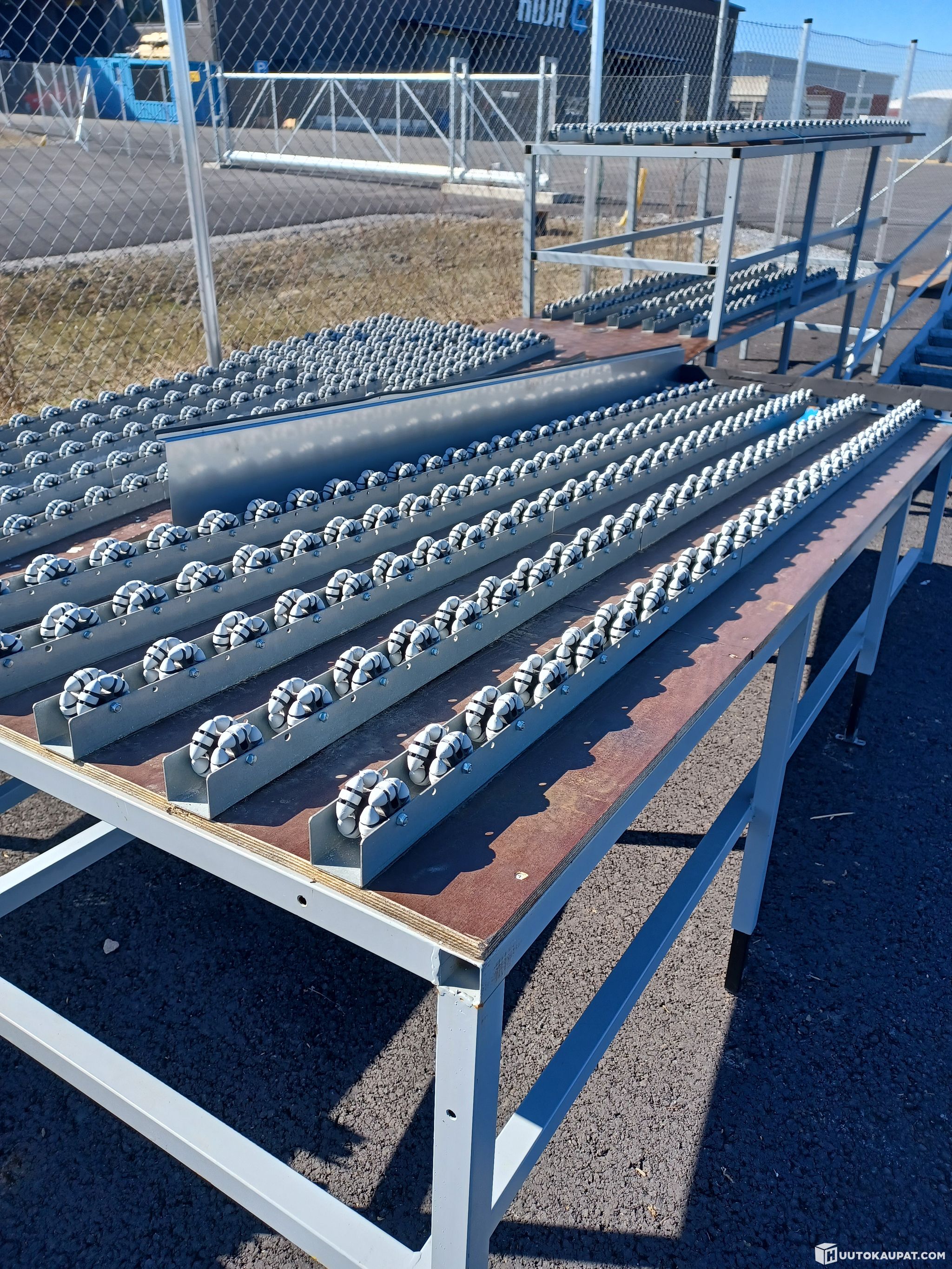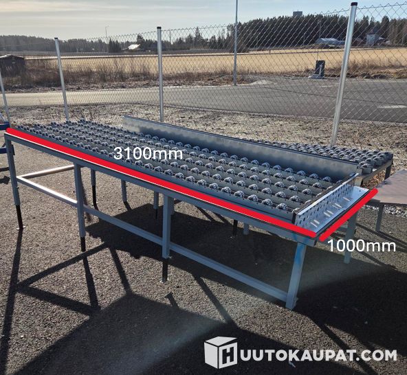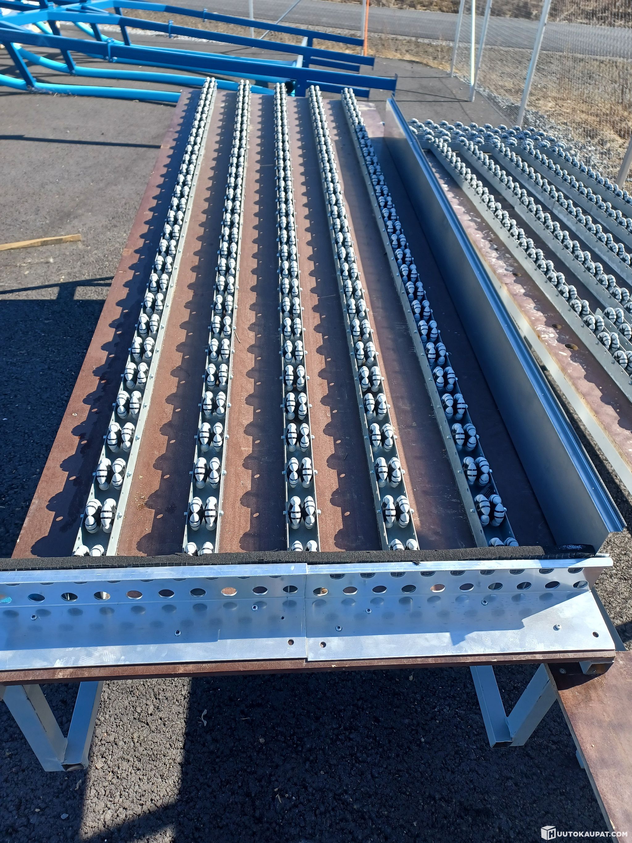 Käytöstä poistettu rullarata säädettävillä jaloilla. Käytön jälkeen säilytetty pihalla.