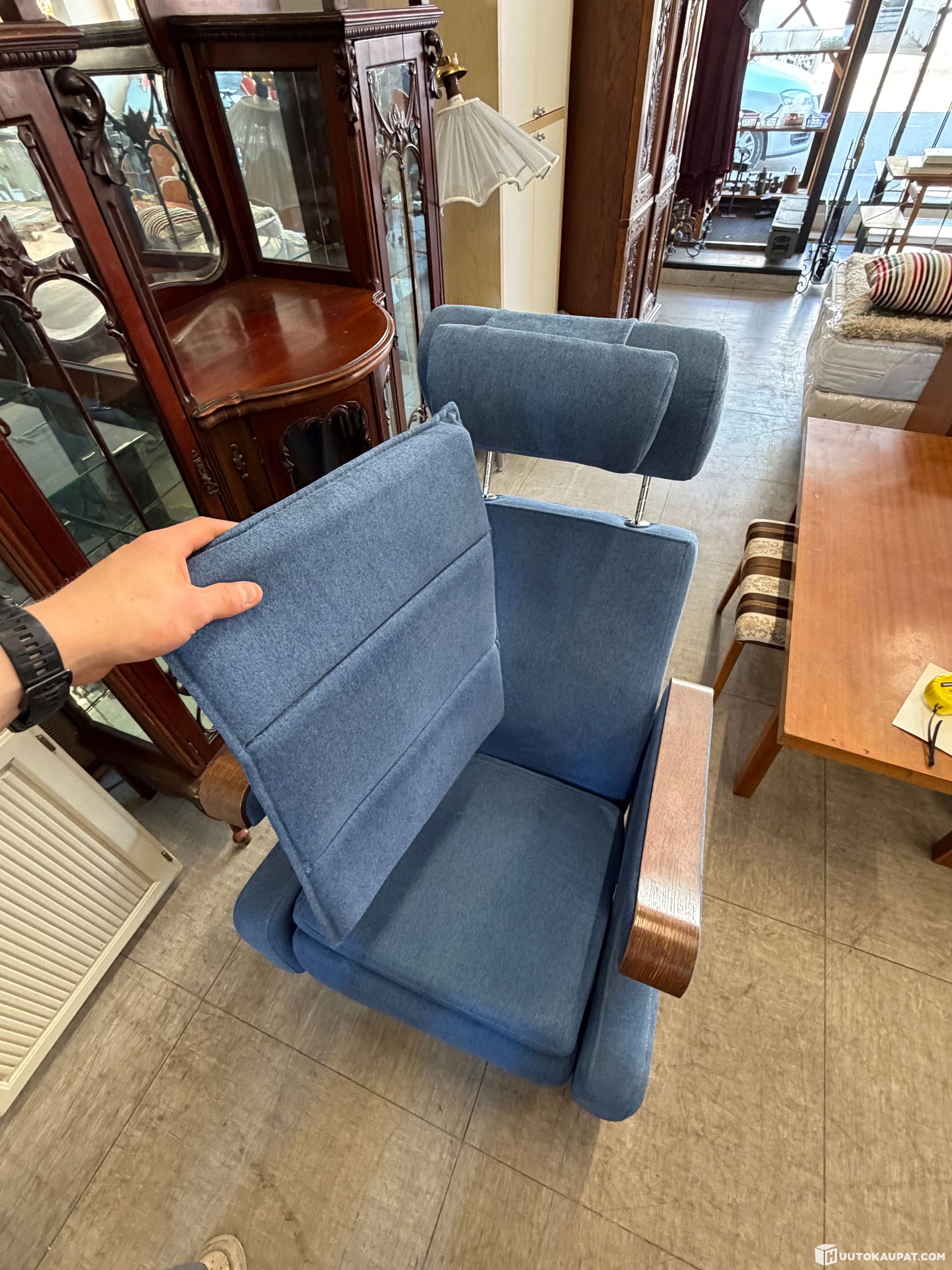 Tummansininen armi aktiivituoli puisilla käsinojilla. Ovh. 1740€ löytyy netistä, joka rahin kanssa. Tämä ilman rahia. Siisti kunto, mekanismi toimii.