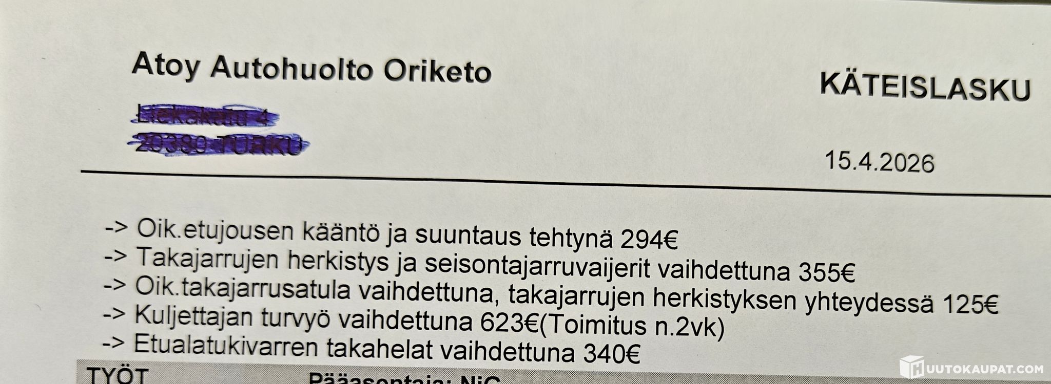 -Viime huollossa havaittu laitettavaa, mm. takaheloihin ja jarruihin liittyen, sekä kuskin turvavyö ei rullaudu kunnolla takaisin. HUOM! Katso viimeinen kuva, viat listattu kustannusarvioineen.