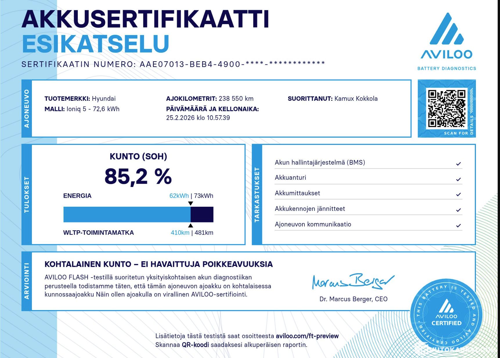 SOH 85.2 % / Suomi-auto / SCC / Ilmastoidut nahat muistilla / 360-kamera / Bose / Bluelink /0.0 l, Sähkö, 160 kW, Automaatti, 238000 km, Korjattavaksi
