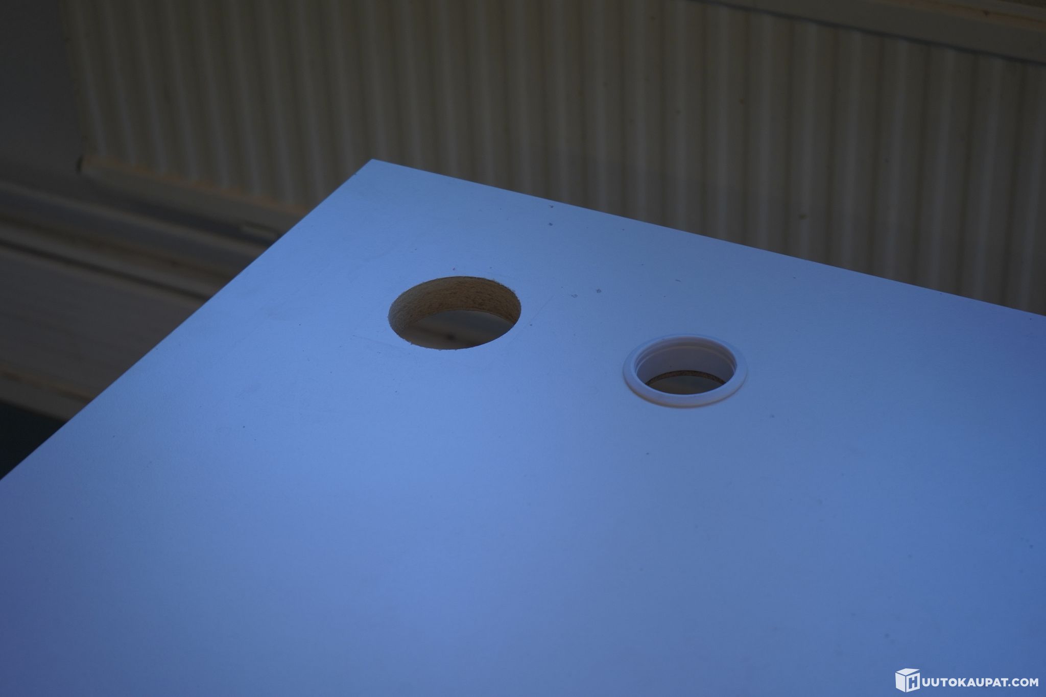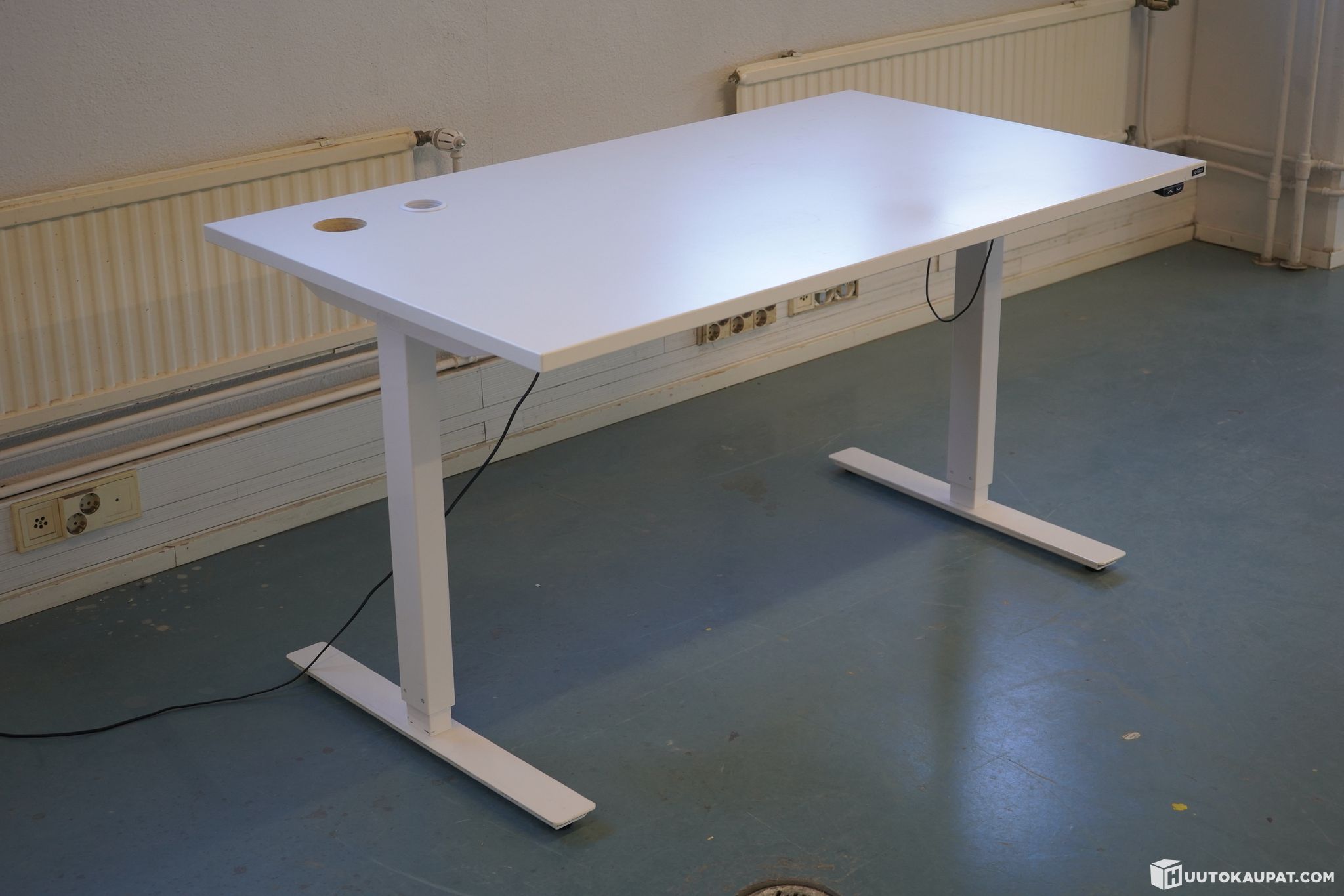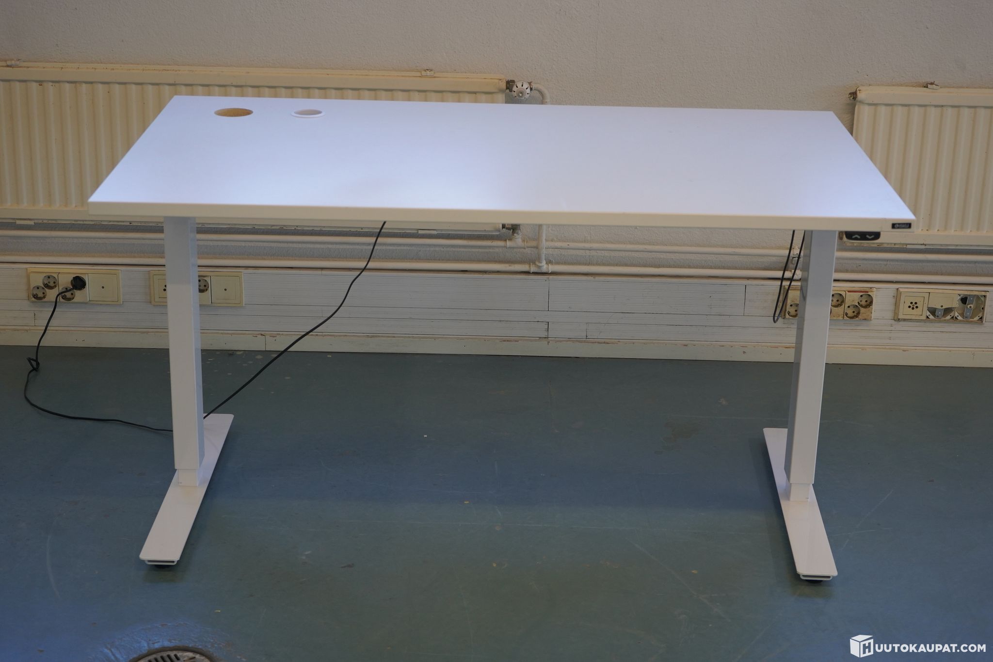 Valkoinen Iskun sähköpöytä. Kannessa kaksi läpivientiaukkoa johdoille.