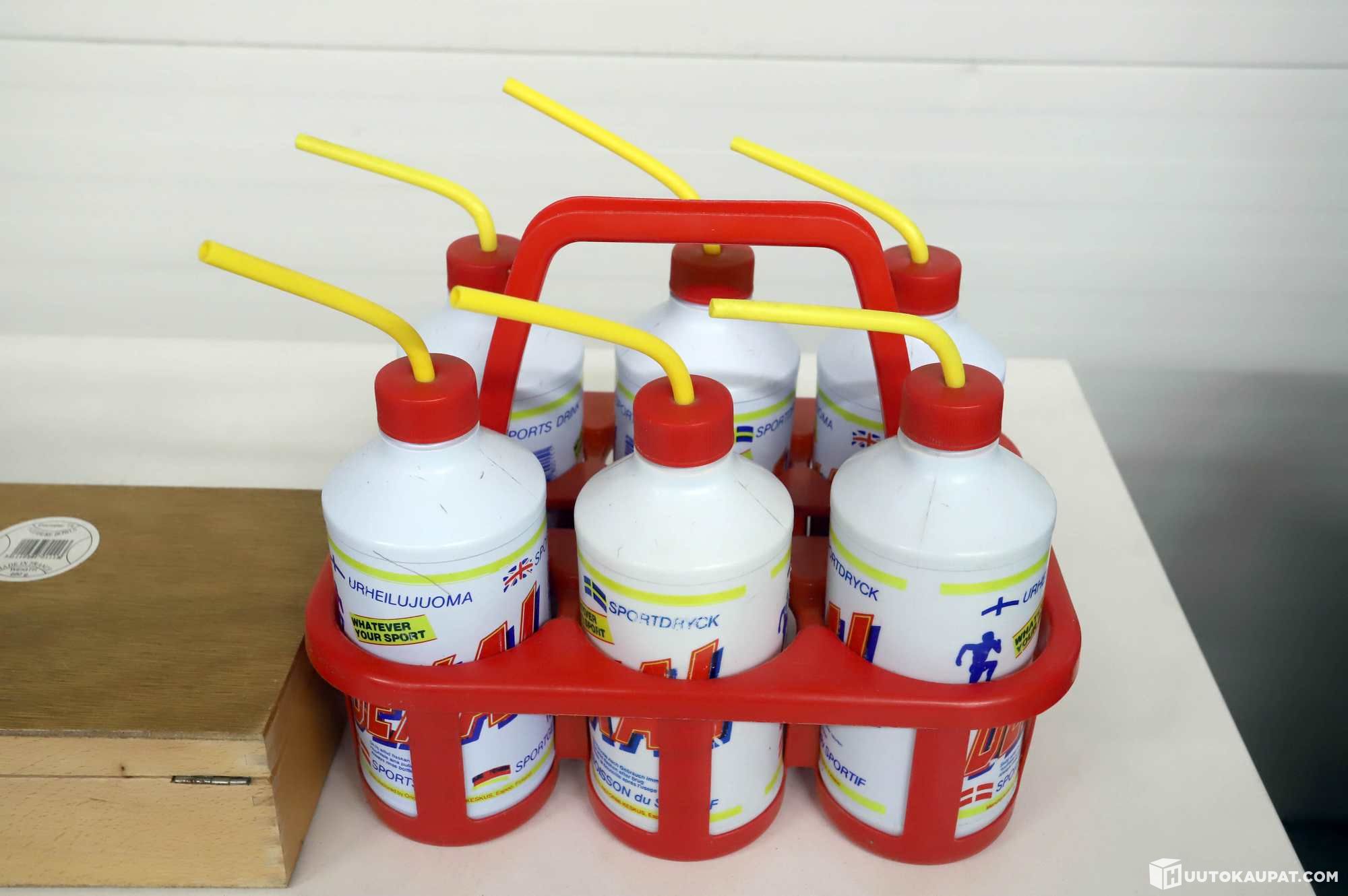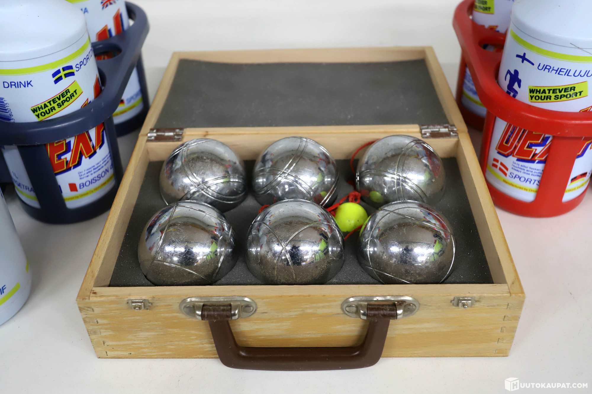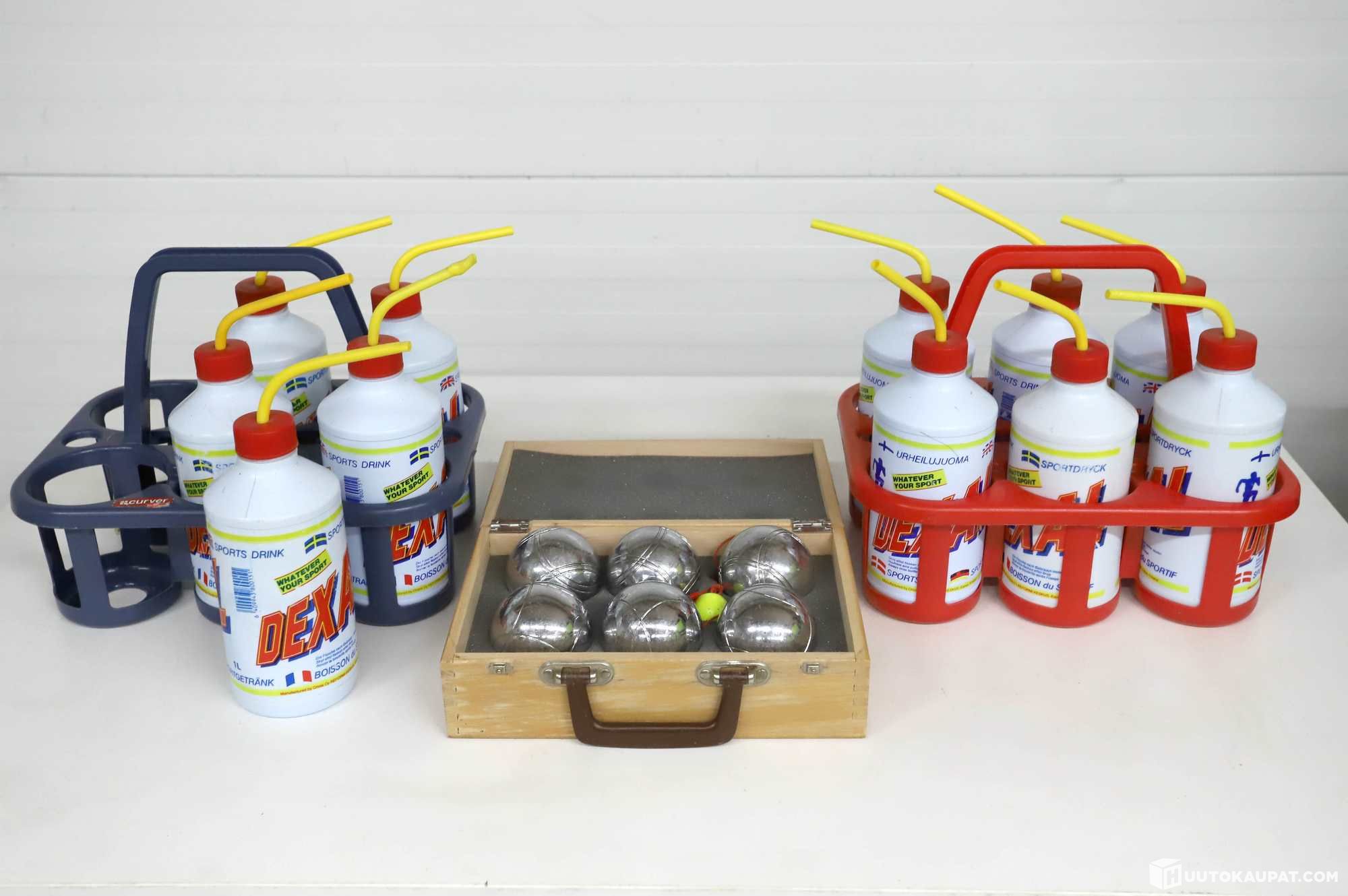 Nostalgiset Dexal-urheilujuomapullot ja petanque-peli.