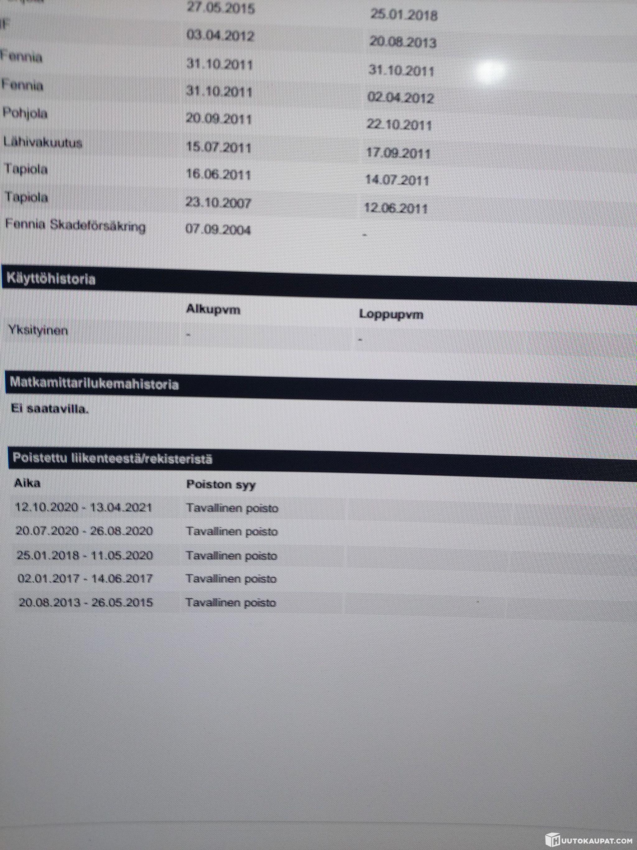 Rekisteröity uudelleen 27.5.2015, mutta tiedossa ei kolarihistoriaa. Tavallinen poisto ollut ajalla 20.8.2013-26.5.2015 ja toinen pidempiaikainen tavallinen poisto 25.01.2018-11.5.2020, syyt ei tiedossa.