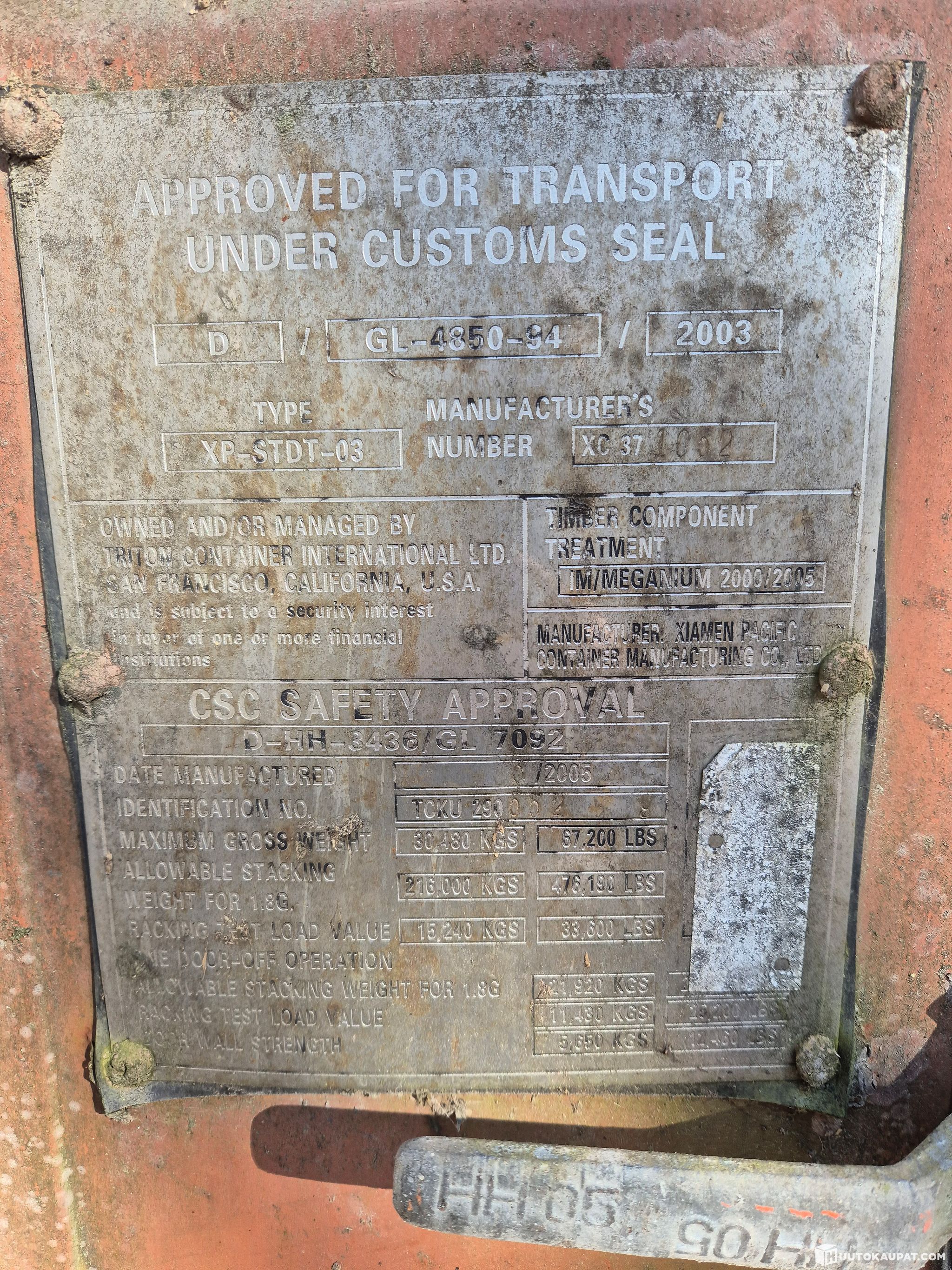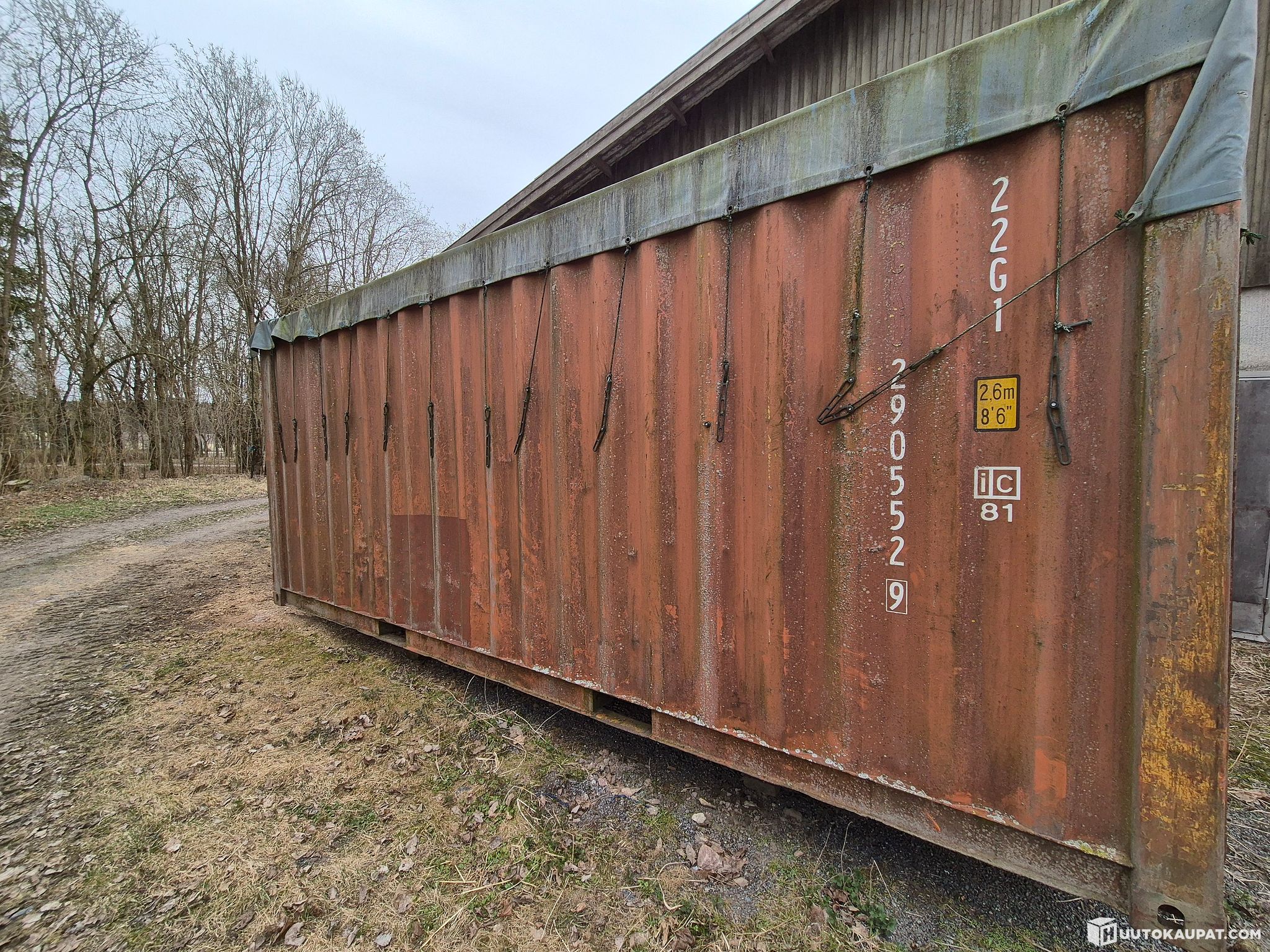 Kontin on liikennöitsijä ottanut kyytiin ja lastauksen on voinut tehdä ylhäältä kauhalla. Metallikaaret pitävät pressun päältä vedet ja lumet poissa. Ovi on tiivis ja toimiva reitti tyhjennykseen. Lattia vaneria.