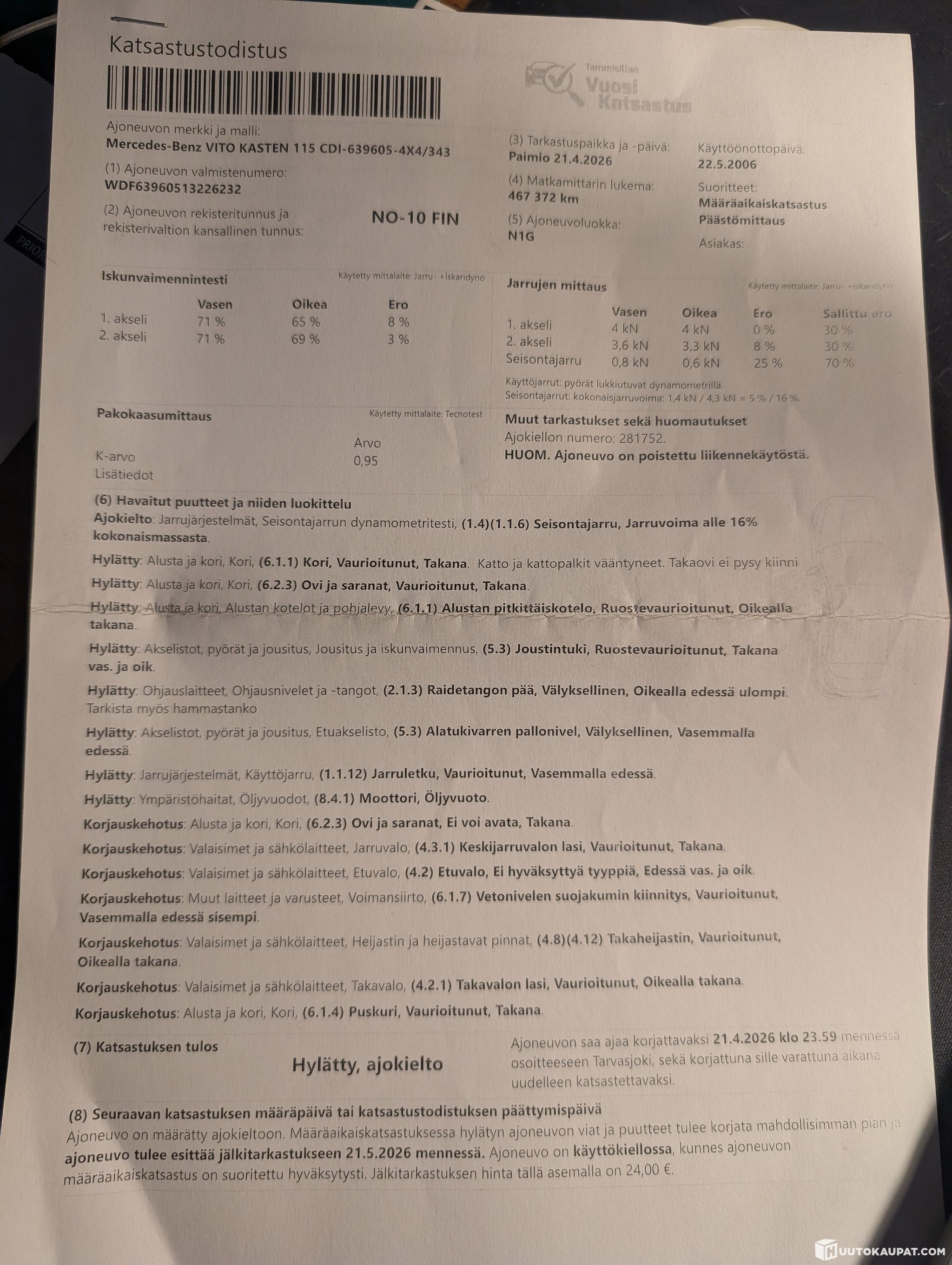 Tekniikaltaan ok 4x4 Vito. Ollut työ käytössä, joten kulumaa ja käytön jälkiä löytyy ympäri autoa. Leima pääsi kylmäksi ja vikalista haettu 21.4.2026 joka kuvissa. Edellis leimalle 2025 pohjaa hitsattu paljon ja jarruosia vaidettu uusiin mm. Takatilan hyllyt ja muu irtaimisto EI kuulu kauppaan, ja ne tullaan poistamaan ennen ajoneuvon luovutusta. Mersu on ajokuntoinen ja siirrettävissä koekilvillä. katsastus insinöörillä taisi olla vain huono päivä ja suurin osa vikalistasta helposti korjattavissa. Mahdollisuus ostaa 16" alumiini vanteet kauden ajetuilla kitkoilla lisähinnasta, joka sovitaan kaupanteko hetkellä.