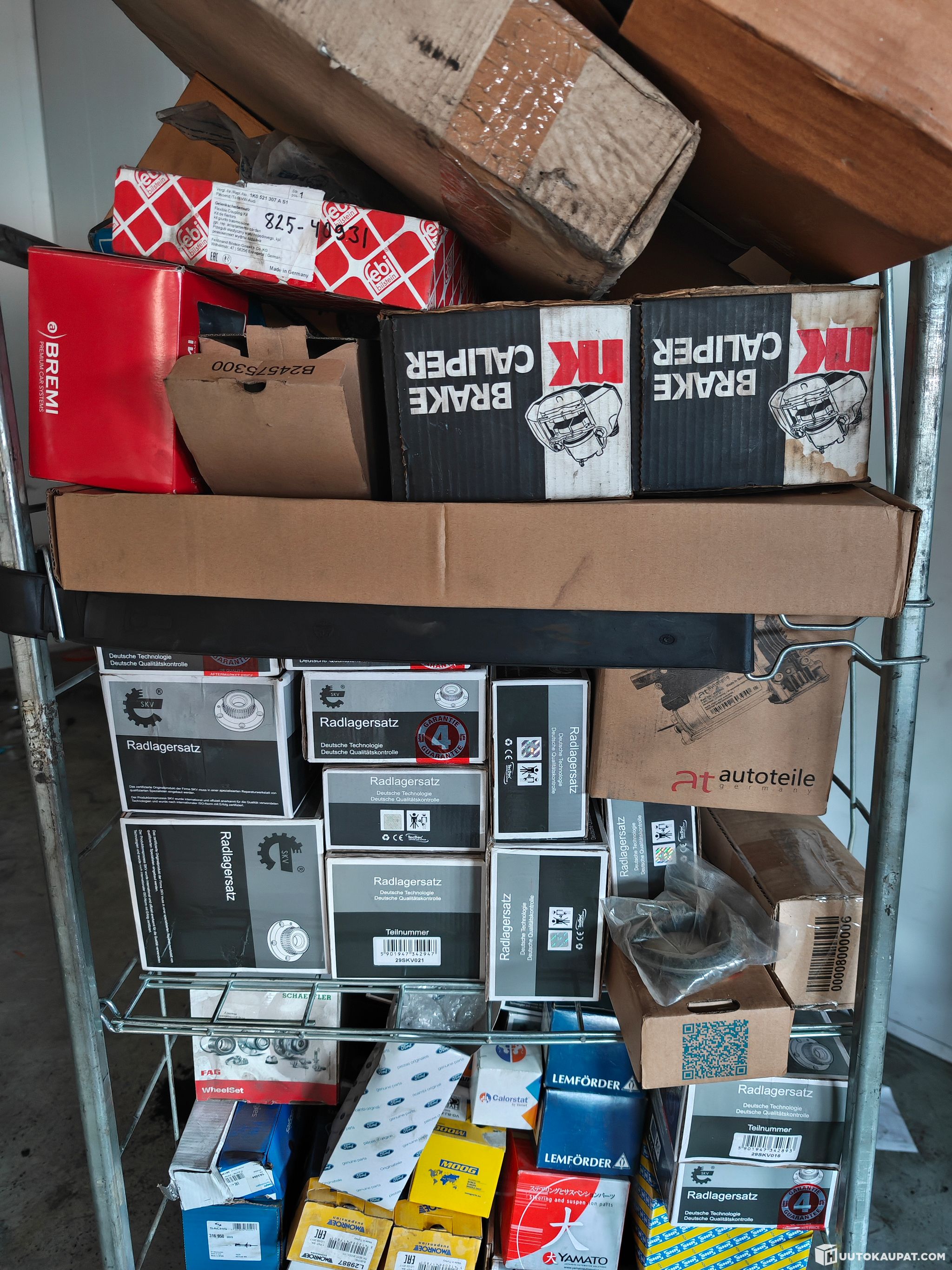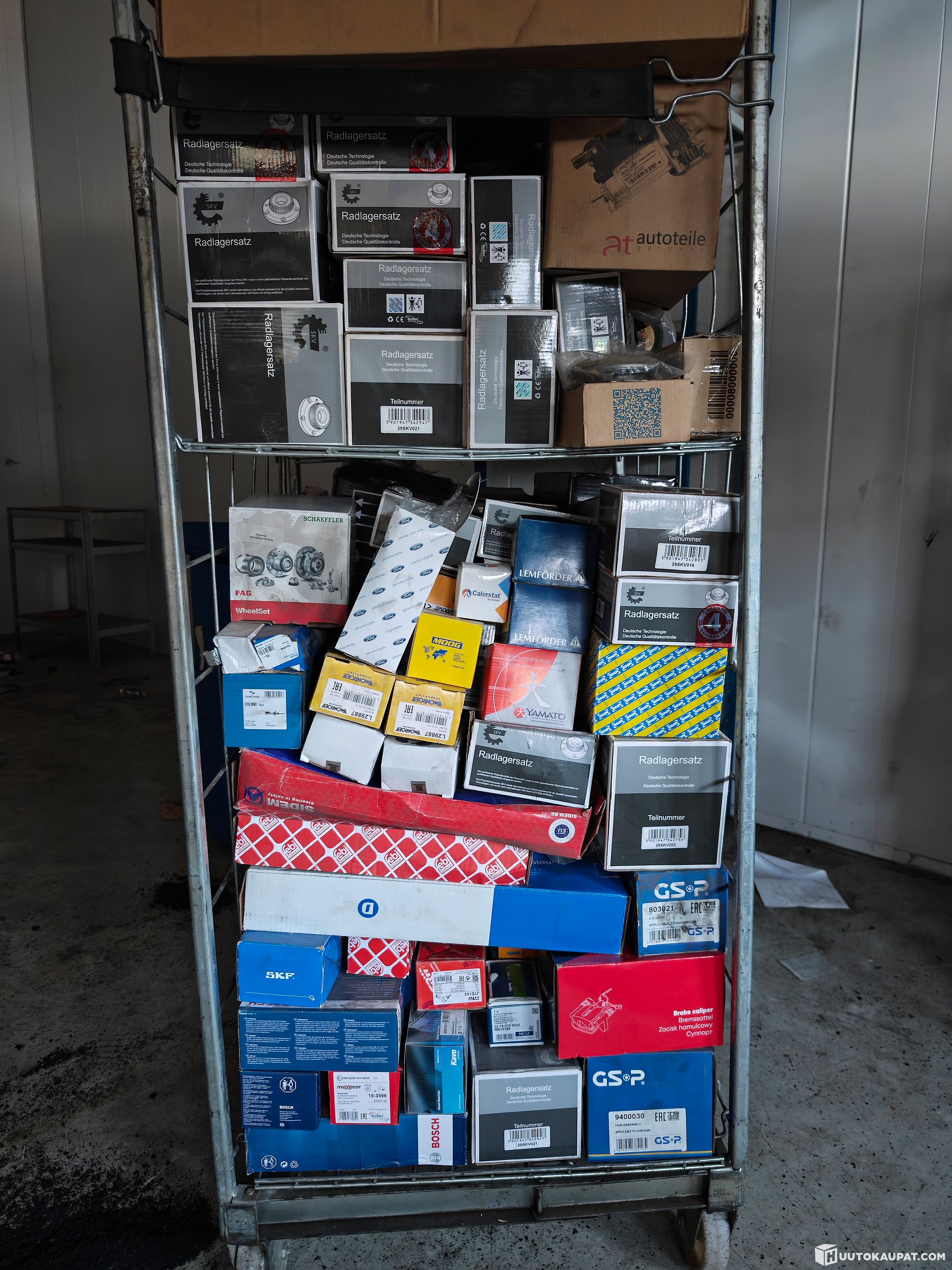Rullakollinen varastoon jääneitä autojen varaosia. Ei varma onko kaikki uusia, mutta ainakin suurin osa on käyttämättömiä.