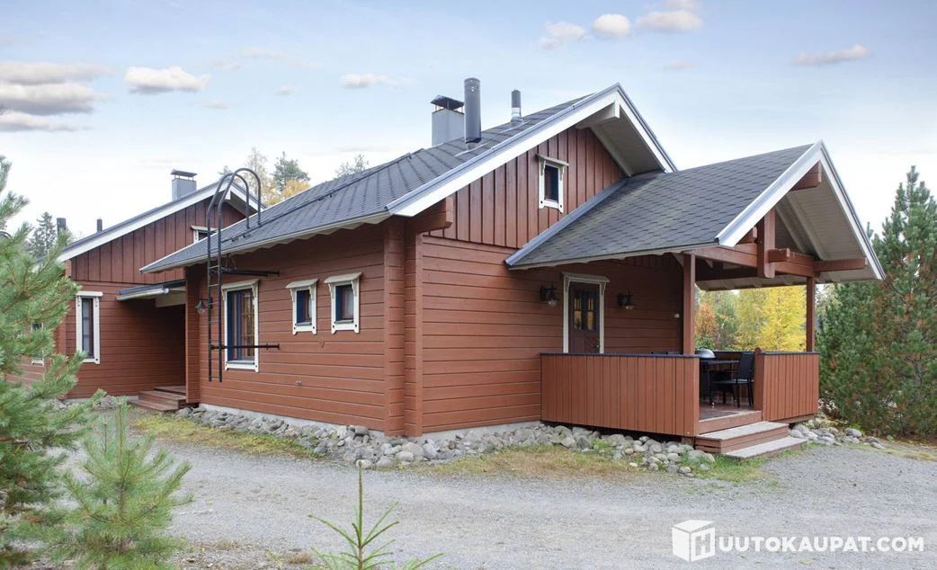 Lamellihirsinen paritalohuoneisto, jossa makuuhuone, olohuone, keittiö, parvi, kylpyhuone, sauna, wc sekä varasto ja kuisti