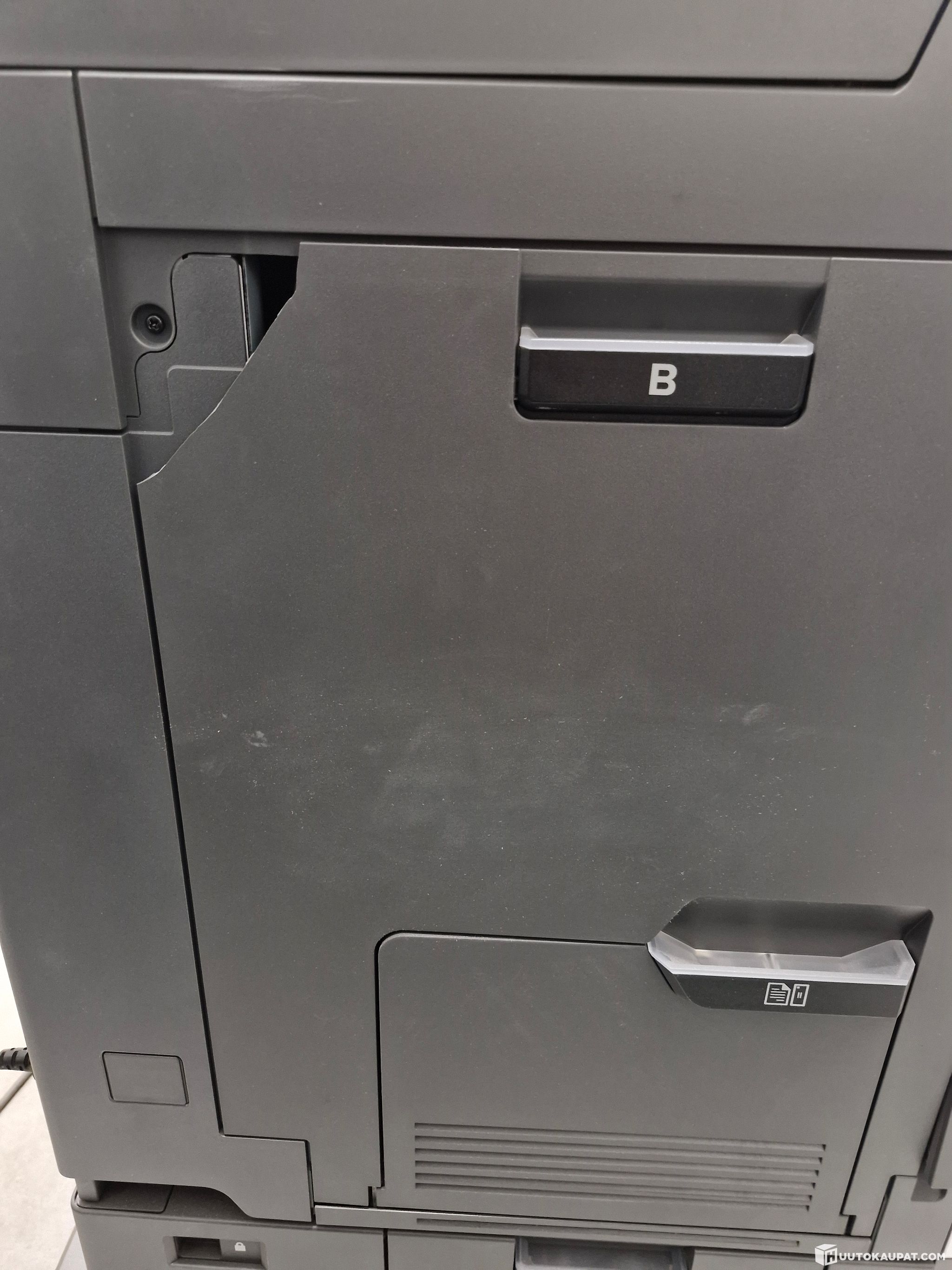 Koneen vasemman puolen luukun takayläkulmassa on selvästi näkyvä vaurio, kuten näkyy viimeisessä kuvassa. Kyseessä on kuitenkin vain kosmeettinen haitta, jolla ei ole vaikutusta laitteen tekniseen toimintaan tai tulostuslaatuun.
