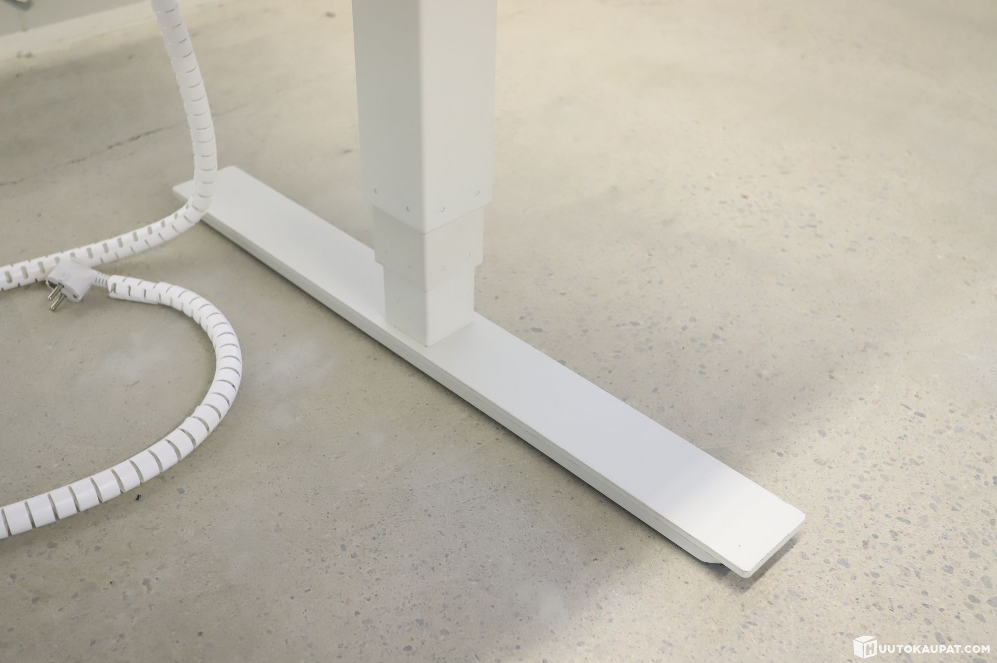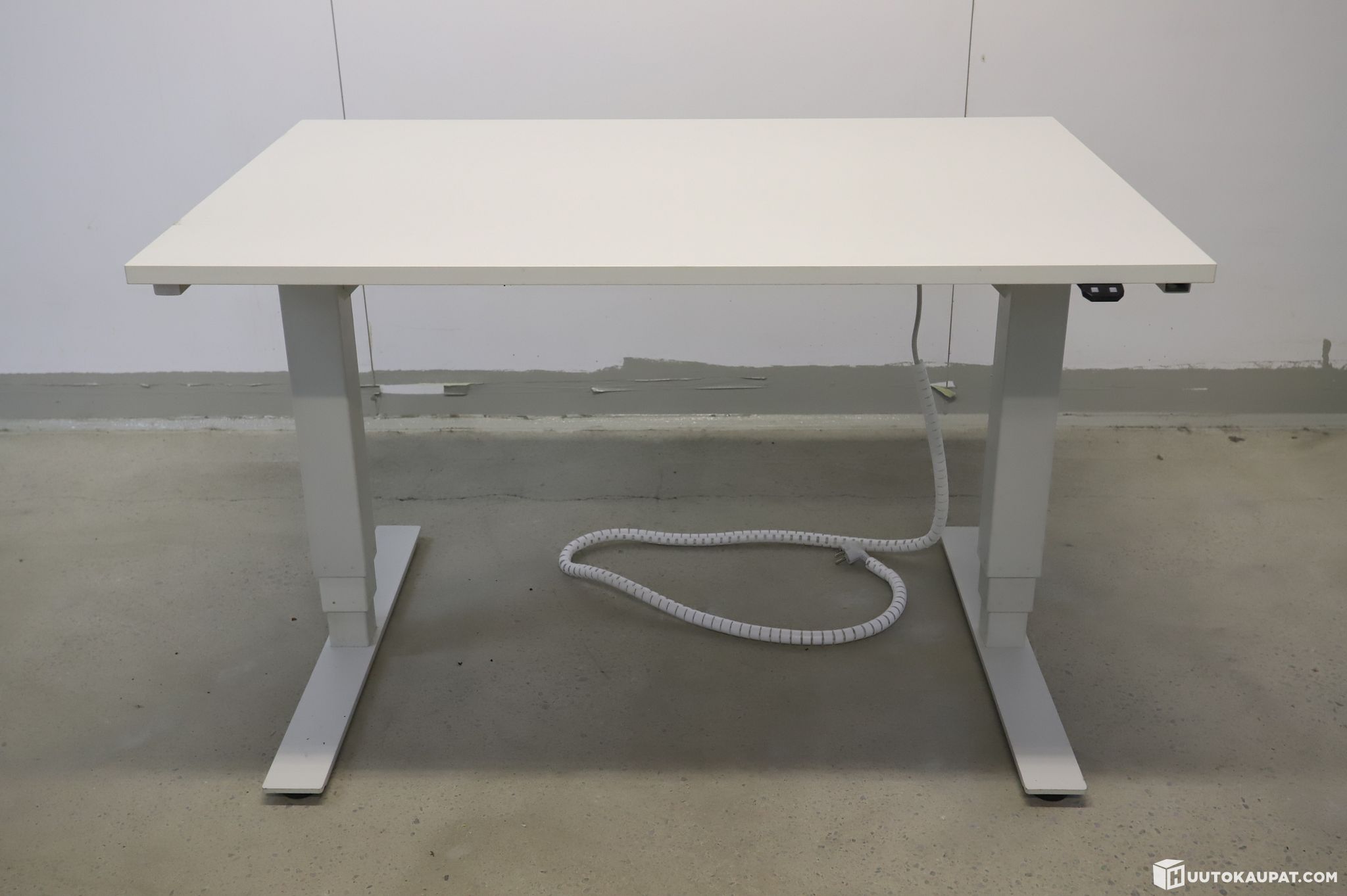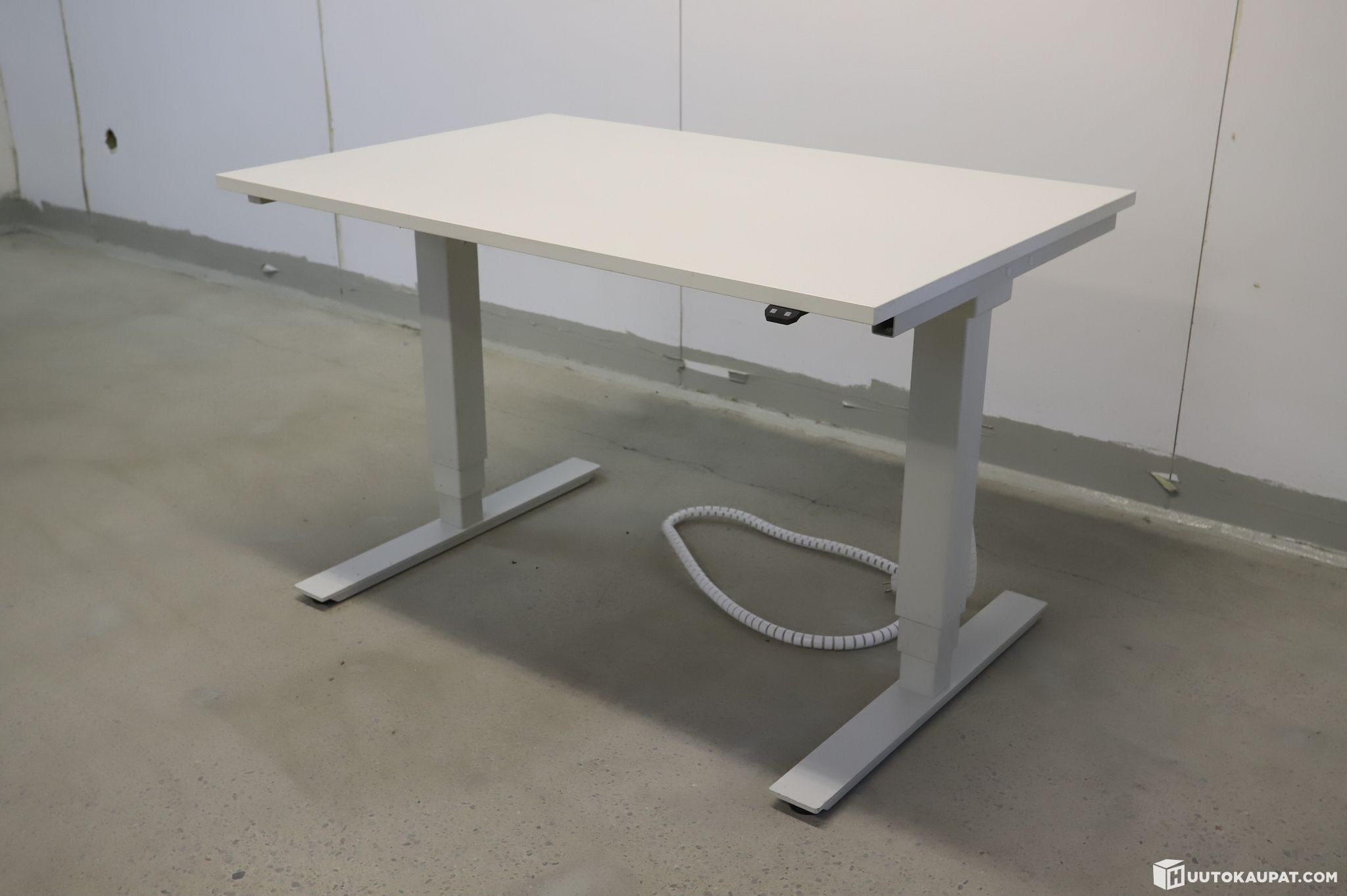 Myydään tukeva ja kompakti sähköpöytä valkoisella kannella.