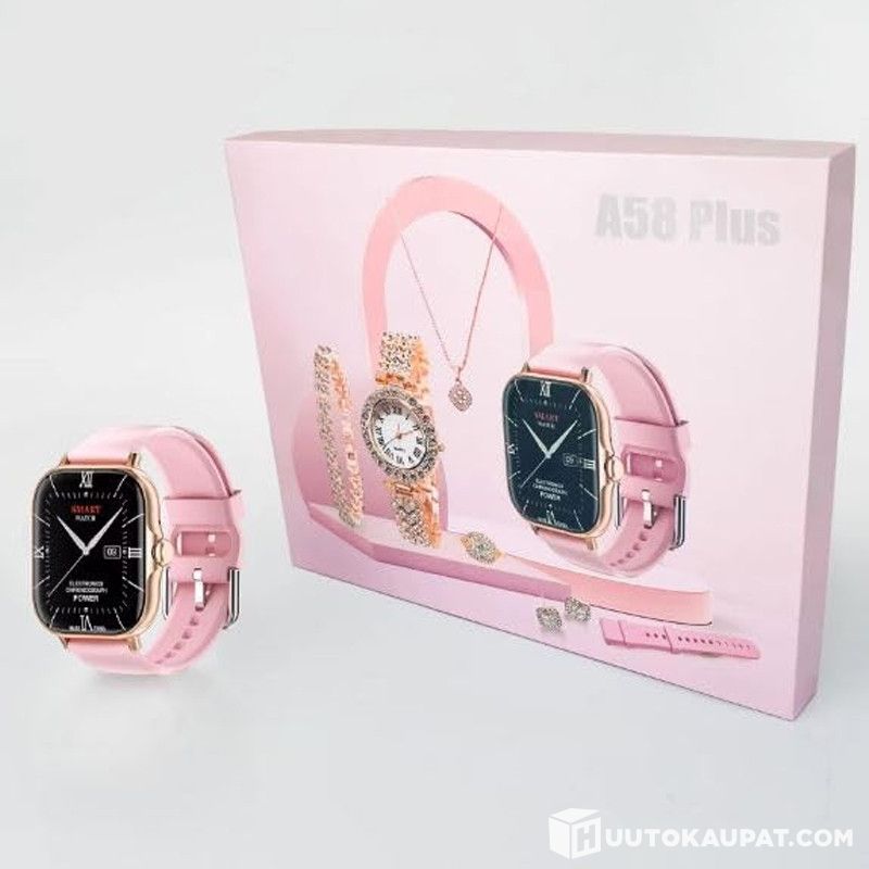 A58 Plus ei ole vain suurinäyttöinen, edistynyt älykello, vaan siinä on myös kaksi vaihdettavaa ranneketta (vaaleanpunainen + harmaa) sekä tyylikkäät korvakorut, sormus, rannekoru ja kaulakoru, jotka tekevät jokaisesta lookista erityisen.