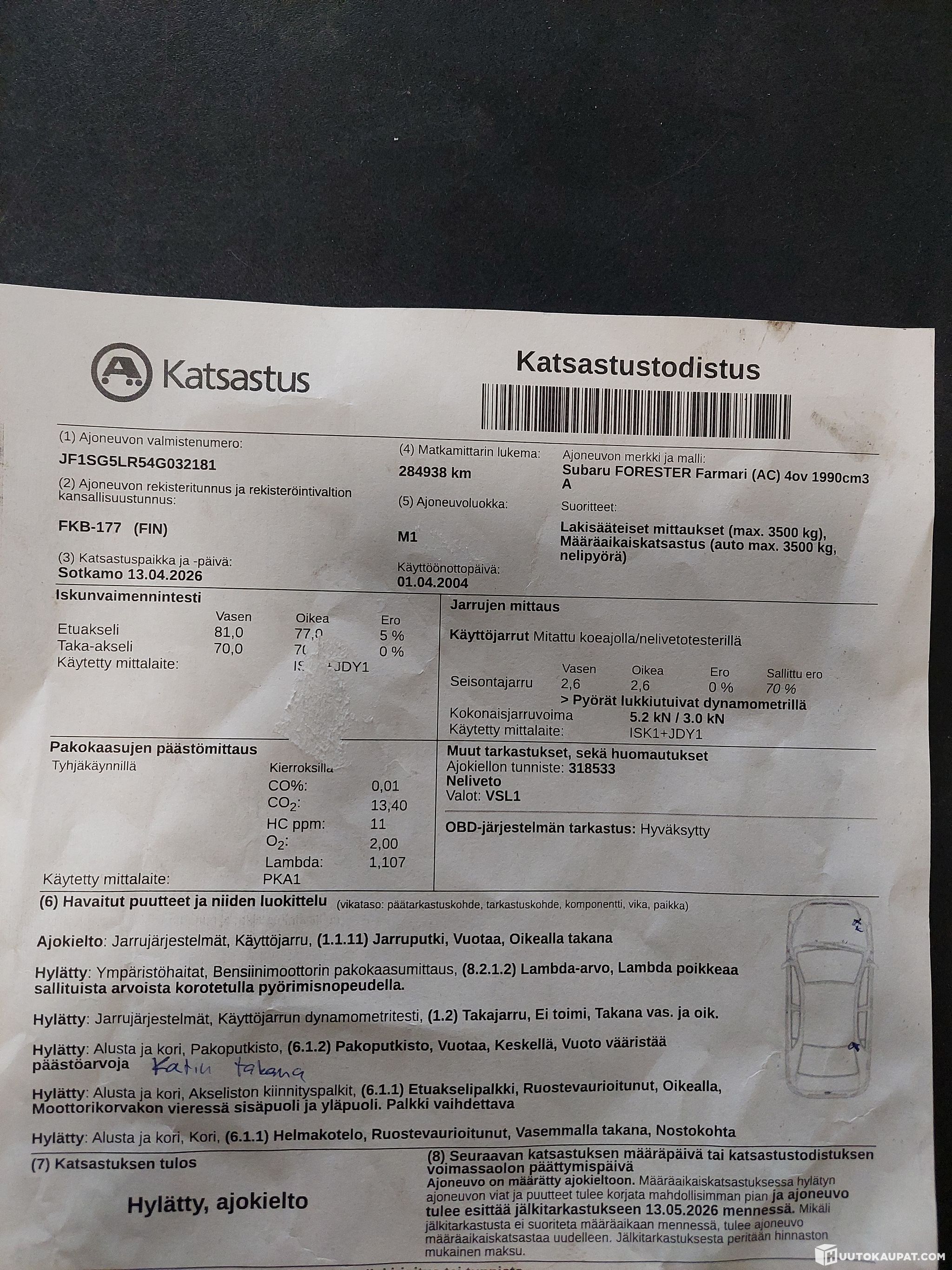 Neliveto subaru suoraan käytöstä, mutta katsastuksessa hylätty ja ajokielto.