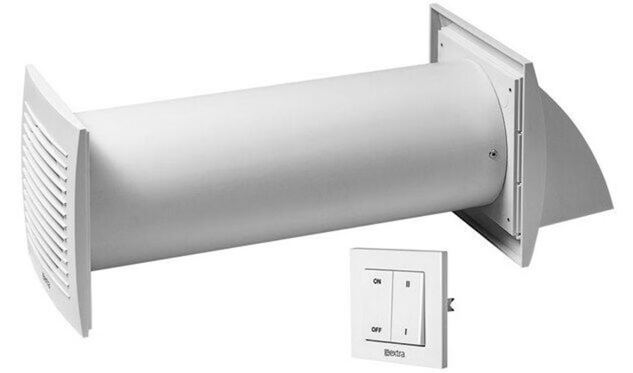 Ilmanvaihtokone, joka korvaa painovoimaisen ilmanvaihdon huone-/tilakohtaisesti. Puhaltaa ja imee ilmaa vuorotellen ulos ja sisään lämmönvaihtimen läpi. Laite ottaa poistoilmasta lämpöenergiaa talteen ja lämmittää sillä sisäänpuhallettavan raittiin ilman. Asennetaan seinän läpi, putken mitta muutettavissa 300–550 mm. Laite voidaan asentaa huonekohtaisesti, tai parantaa olemassaolevaa painovoimaista ilmanvaihtoa. Laite on helppo asentaa. Kuluttaa erittäin vähän sähköä. Äänitaso vain 47 dB. Iso kapasiteetti, maks. 45 m³/h. Pestävä suodatin. Tekniset tiedot ja ominaisuudet: • ohjaus: 100S-seinäkytkimellä • putken pituus: 300–550 mm (muutettavissa) • putken halkaisija: 100 mm • etupaneelin mitat: 140 x 140 mm • väri: valkoinen • virta: 230 V / 50 Hz • äänitaso: 47 dB • kapasiteetti (maks.): 45 m³ • pestävä suodatin