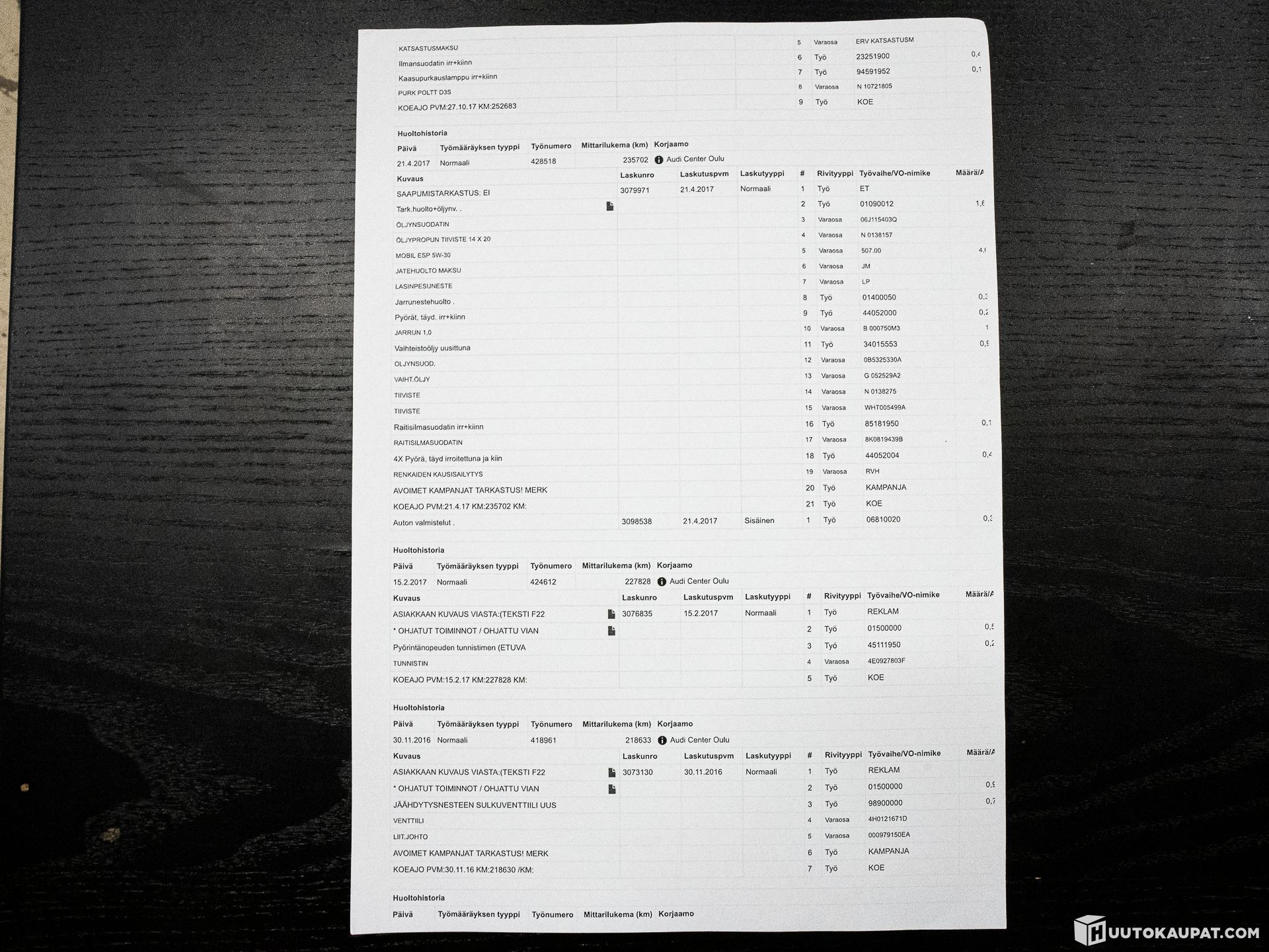 Koeajon aikana ei havaittu mitään erityistä. Hyvä ajaa, kone kuulostaa terveeltä ja laatikko toimii. Äkkiseltään kokeiltuna pelitti myös kaikki varusteet. Ketju vaihdettu 2019. Paljon kuitteja! Kts. kuvat. Audilla tyypillisiä ruosteenalkuja siellä täällä, kts. kuvat. Vaihdossa tullut meille ja kokeillaan huutokaupan kautta saada raha nopeasti liikkumaan. Jos ei mene tätä kautta niin jää omaan myyntiriviin.