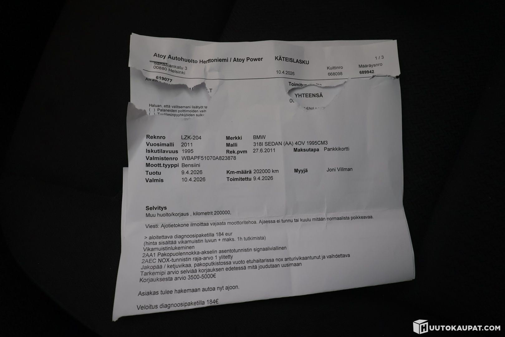 HUOM! Auto myydään teknisten vikojen vuoksi korjattavaksi. Lue ilmoitus huolellisesti.