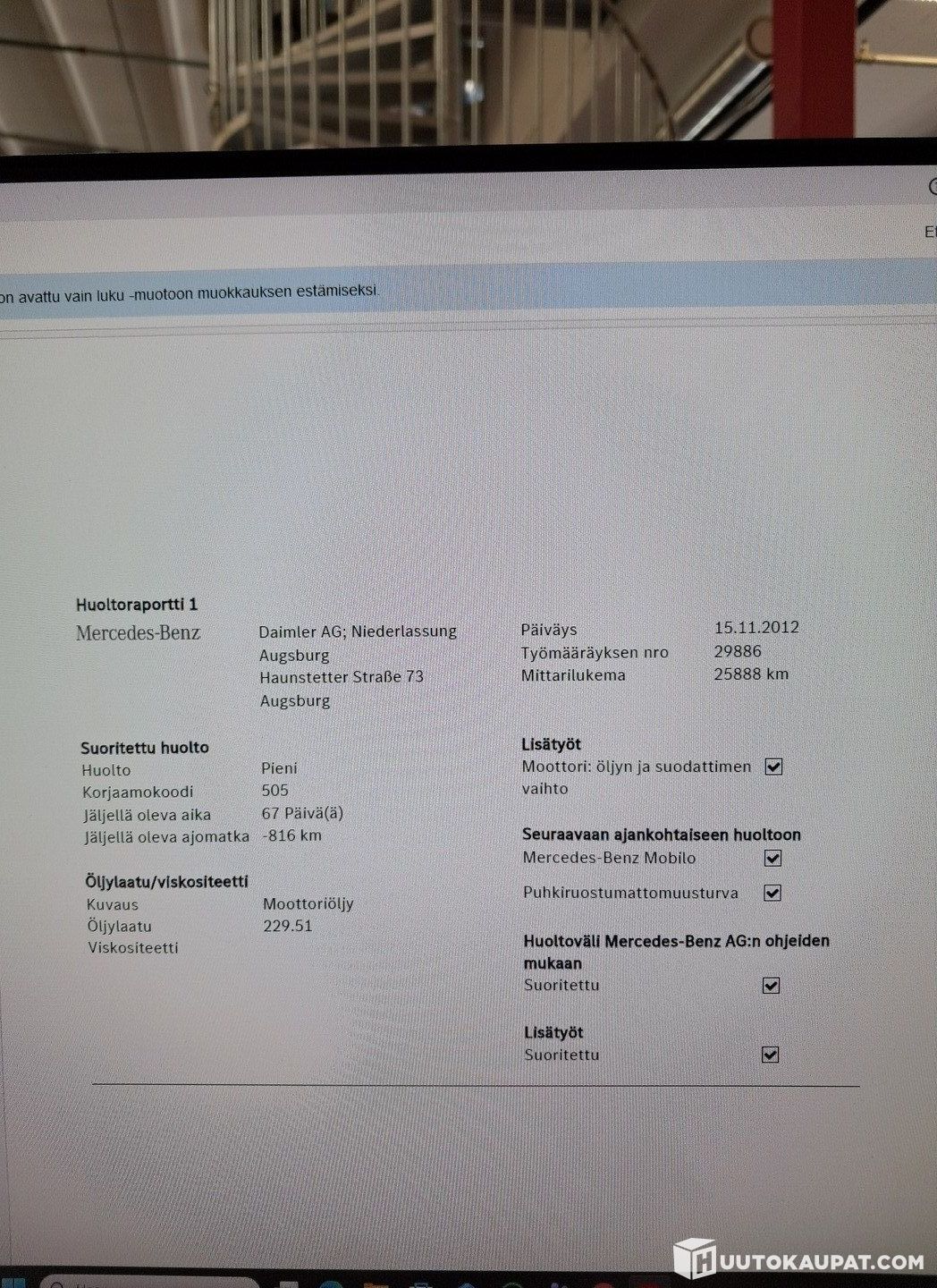 Auto ei ole ollut toimestamme teknisessä kuntotarkastuksessa eikä kaikkien varusteiden toimivuutta ole testattu. Siinä saattaa olla piileviä vikoja, joita koeajolla emme havainneet. Autoon on mahdollista tulla tutustumaan tarkemmin ennen sitovan huudon tekemistä. Sovithan tulostasi etukäteen, kiitos.