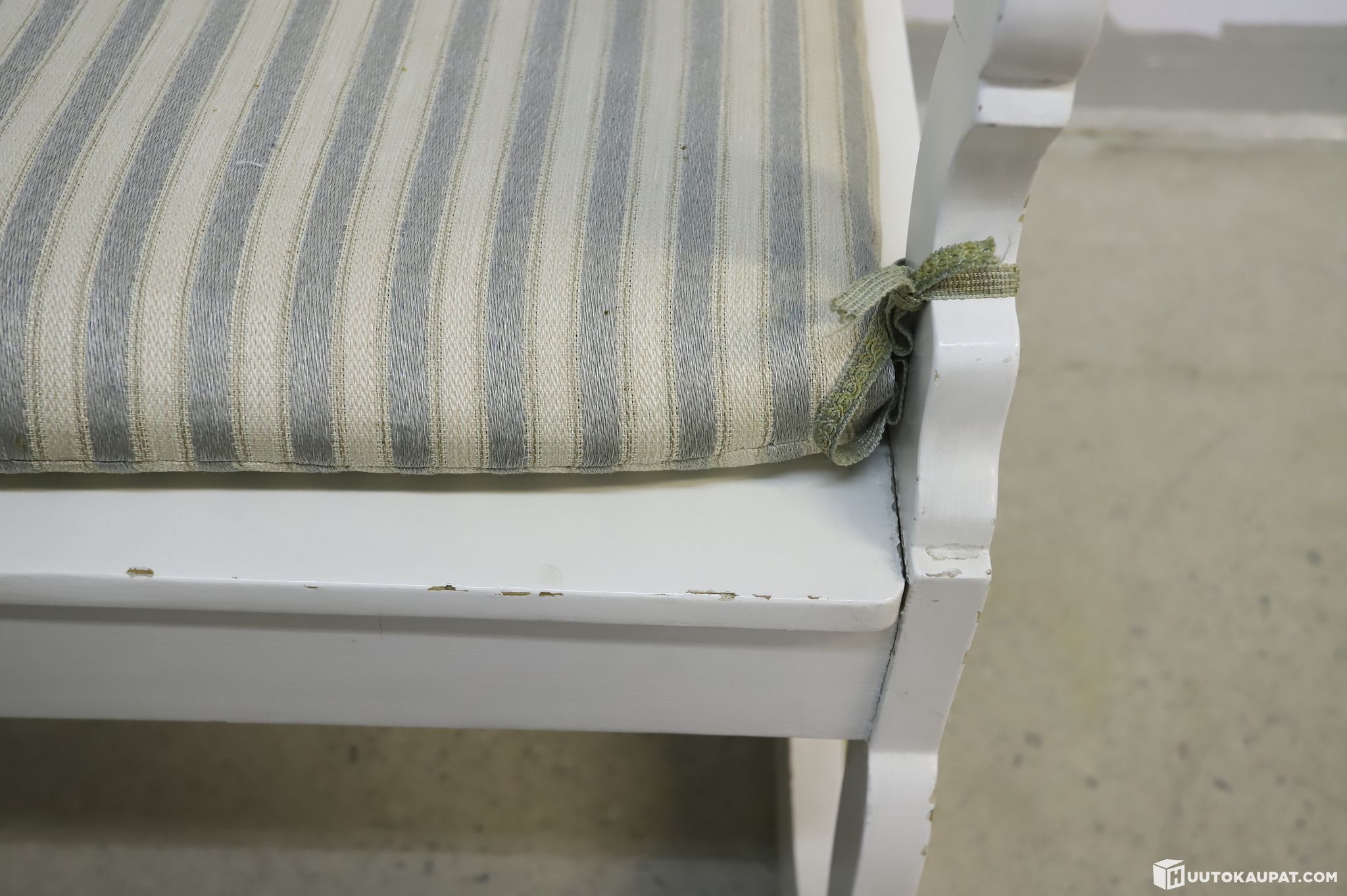Kalusteet ovat tukevia ja hyväkuntoisia. Valkoinen maalipinta on siisti, mutta siinä on iän tuomaa pientä patinaa ja kulumaa, joka vain korostaa huonekalujen luonnetta. Sohvan pehmuste kannattaa pesaista.