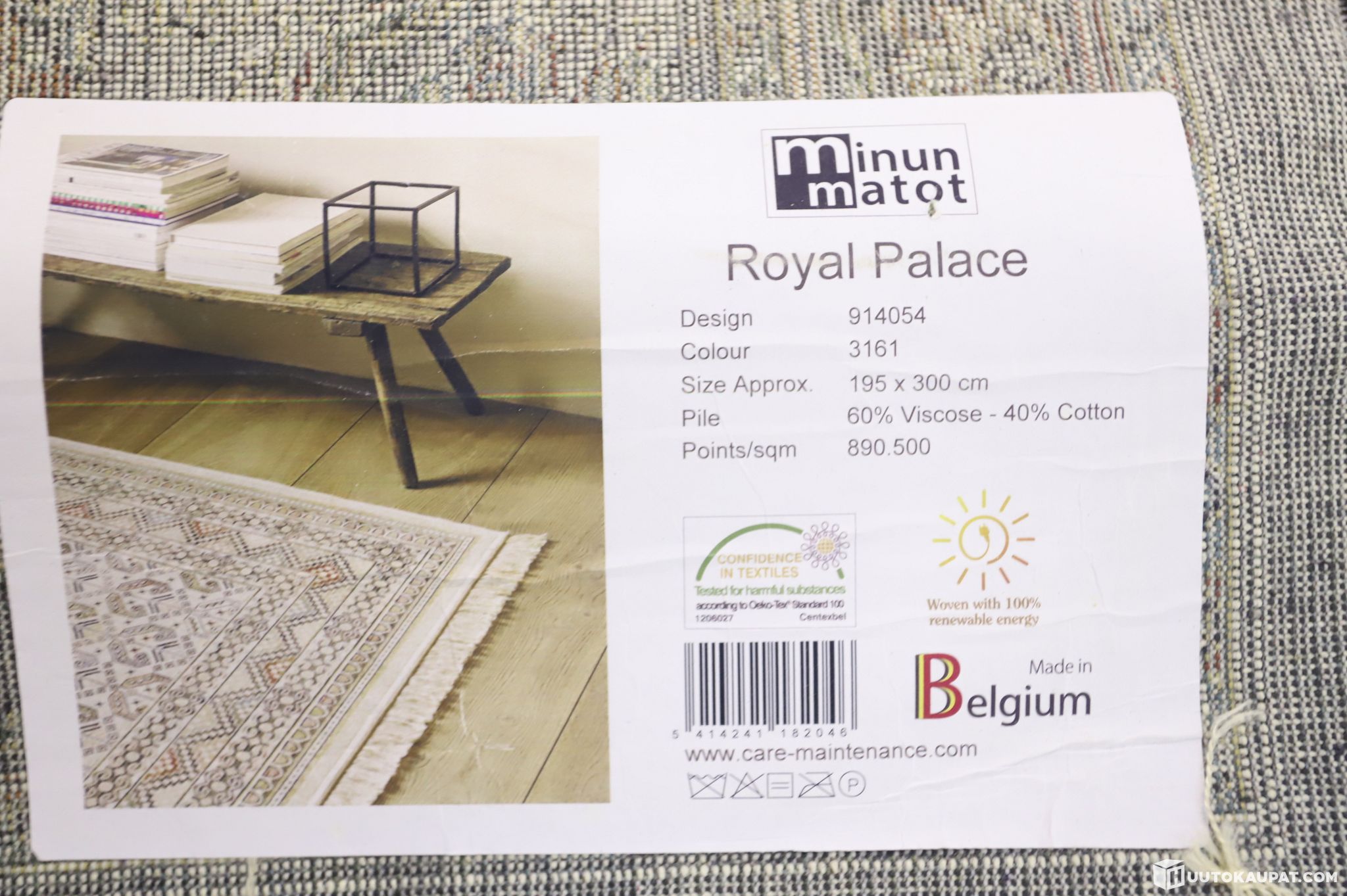 Matto on siisti ja hyväkuntoinen. Tuotelaput ovat edelleen tallessa maton kääntöpuolella. Matossa on pölyä.