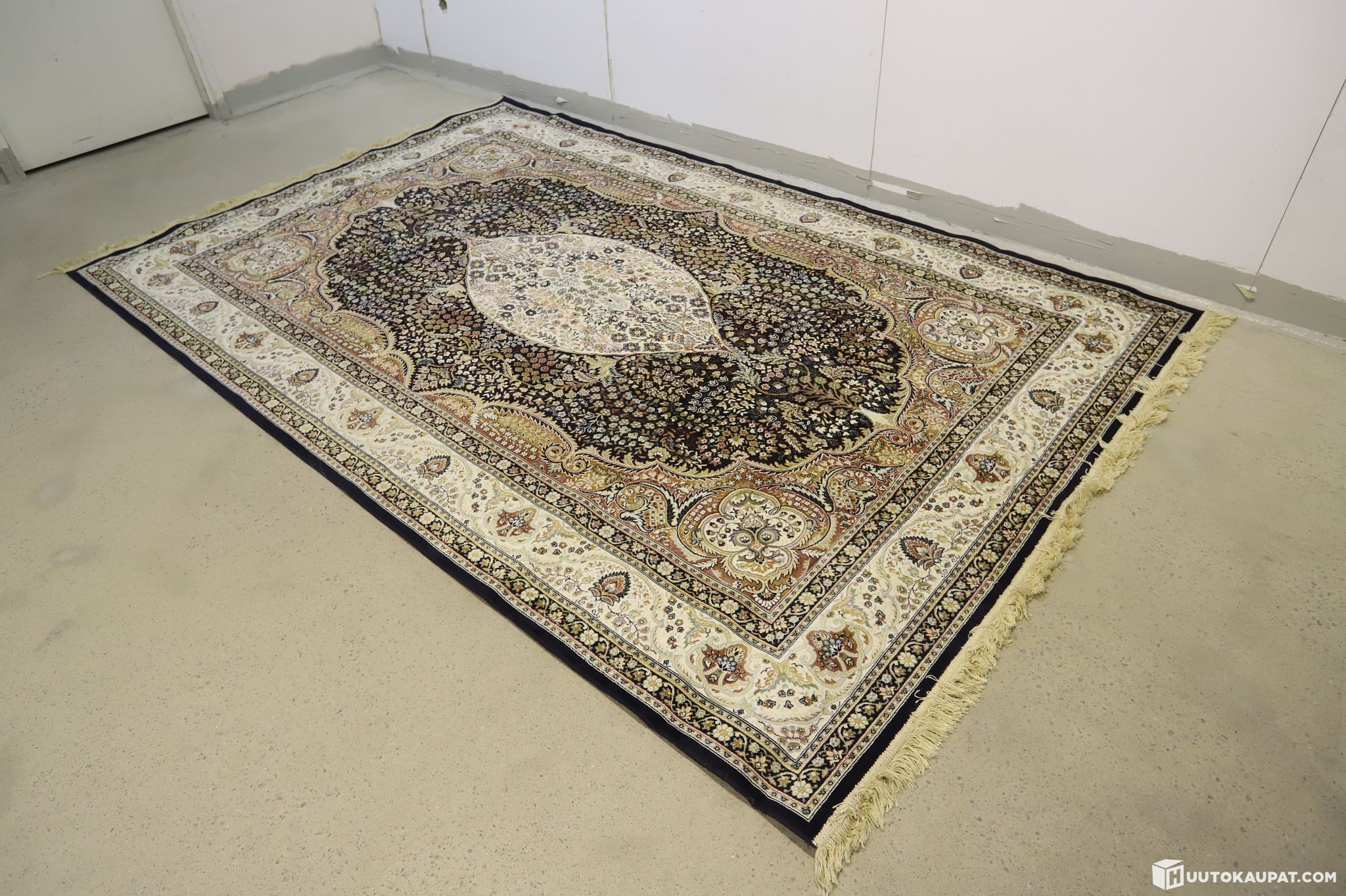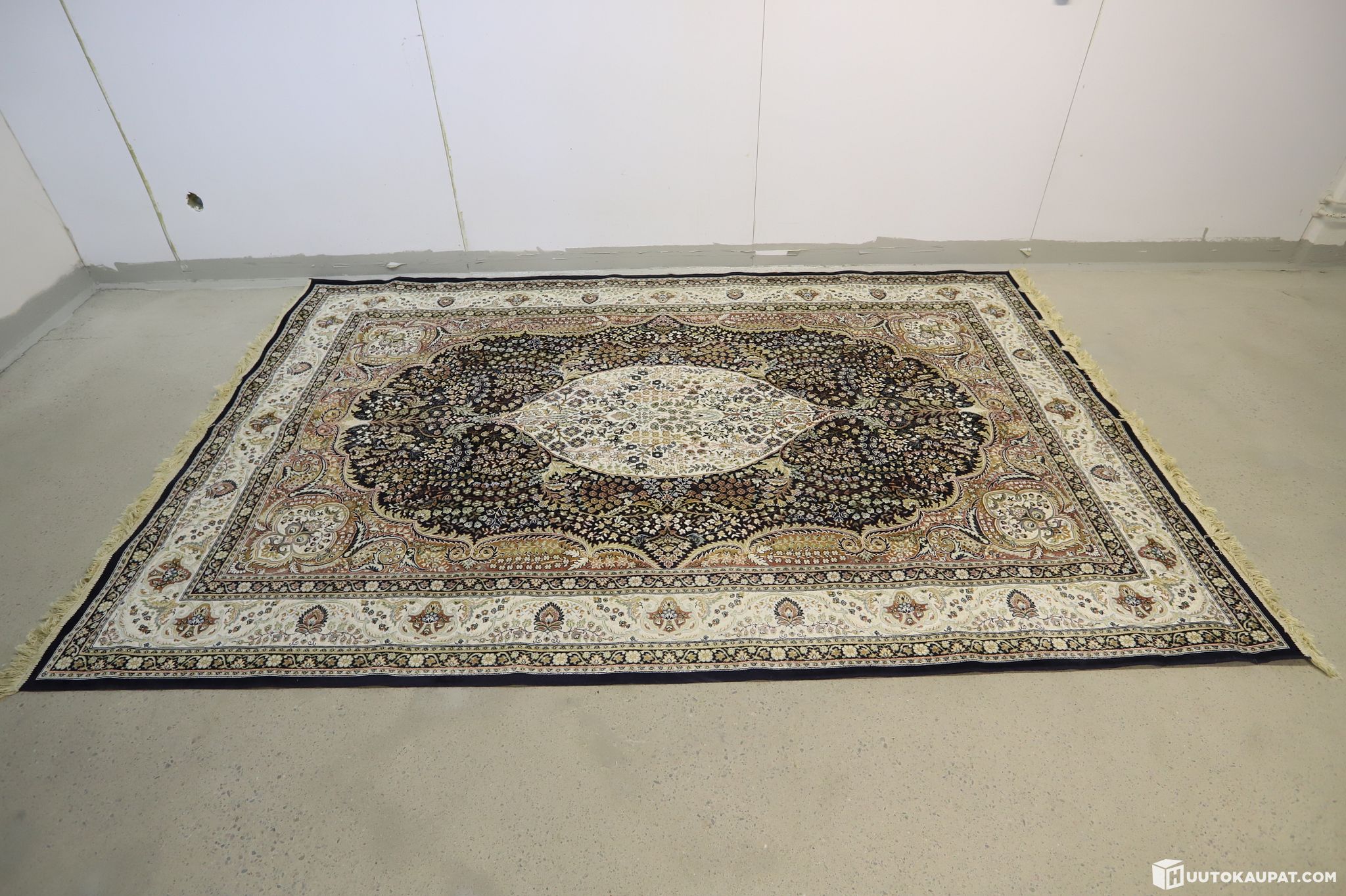 Myydään erittäin tyylikäs ja suurikokoinen Royal Palace -sarjan matto. Matossa on klassinen itämainen kuviollinen design (malli 914054), jossa yhdistyvät kauniit tummat ja vaaleat sävyt sekä hienovaraiset yksityiskohdat. Maton päissä on tyylikkäät hapsut.Tämä matto on kudottu Belgiassa erittäin tiheäksi (890 500 pistettä/m²), mikä tekee siitä kestävän ja antaa sille ylellisen tuntuman. Viskoosi (60 %) tuo pintaan kauniin silkkimäisen kiillon, joka elää valon mukaan.