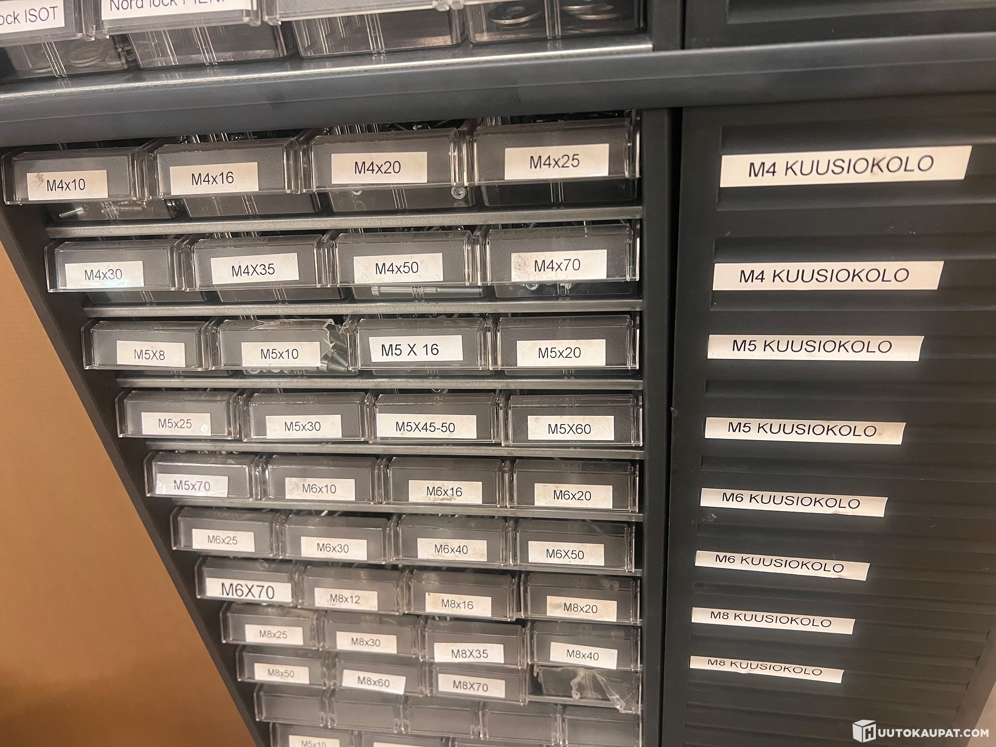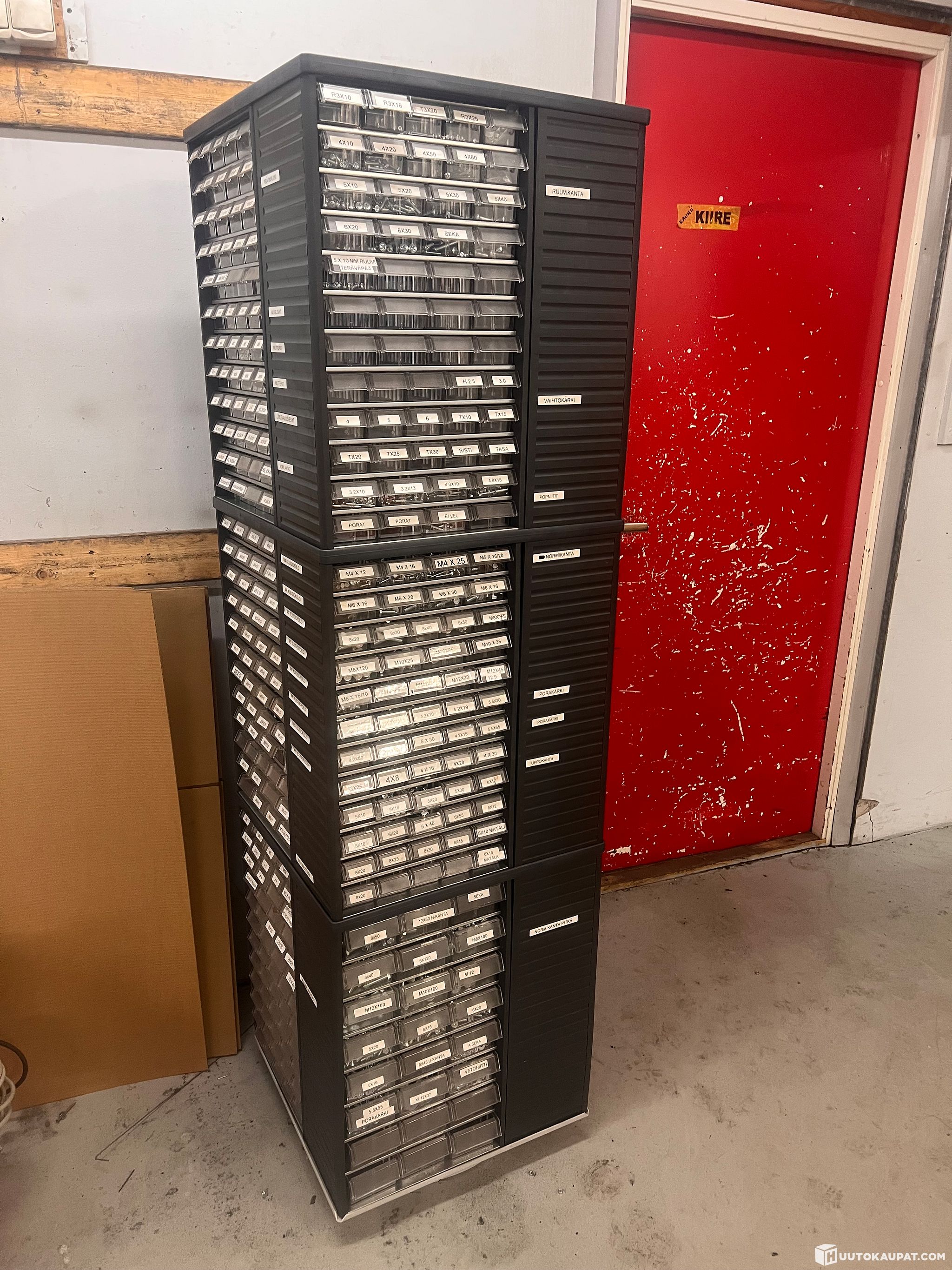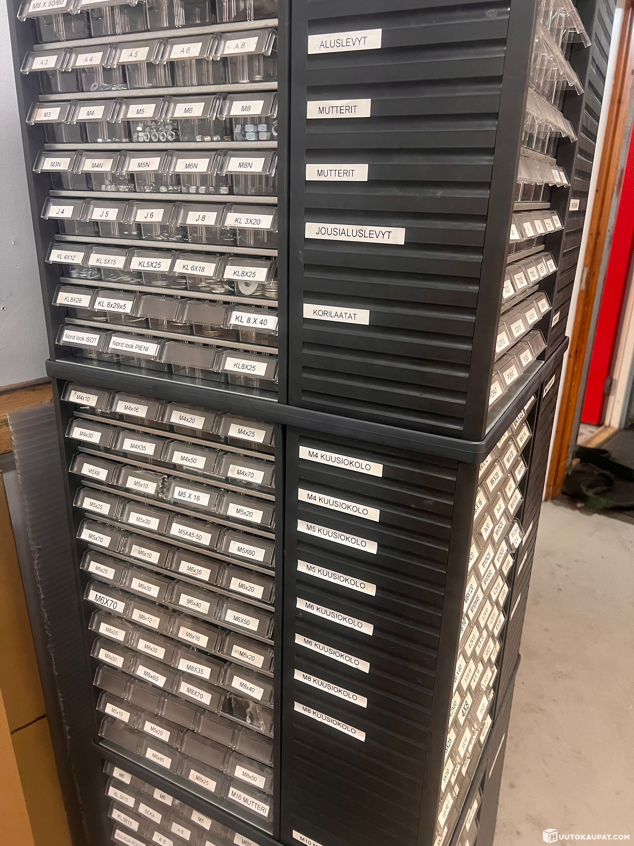 Pyörivä hyllylaatikosto, jossa vaihteleva määrä tarvikkeita (pultteja, muttereita, paineilmaliittimiä jne). Ostaja vastaa purusta ja siirrosta.