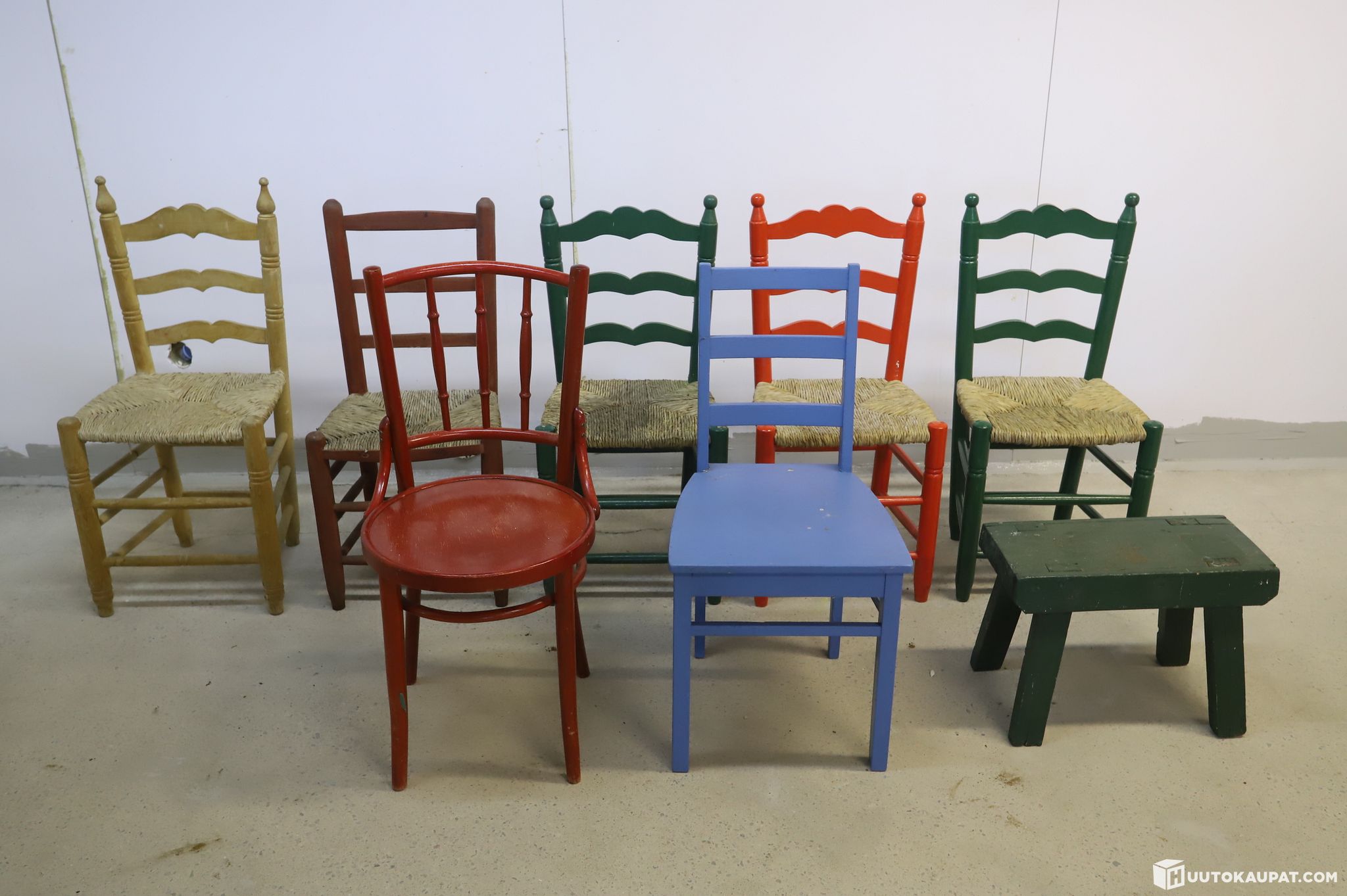 Myydään persoonallinen ja iloinen kokoelma erilaisia puutuoleja. Tästä kerralla näyttävä setti esimerkiksi kesämökille, kuistille tai piristykseksi keittiöön!