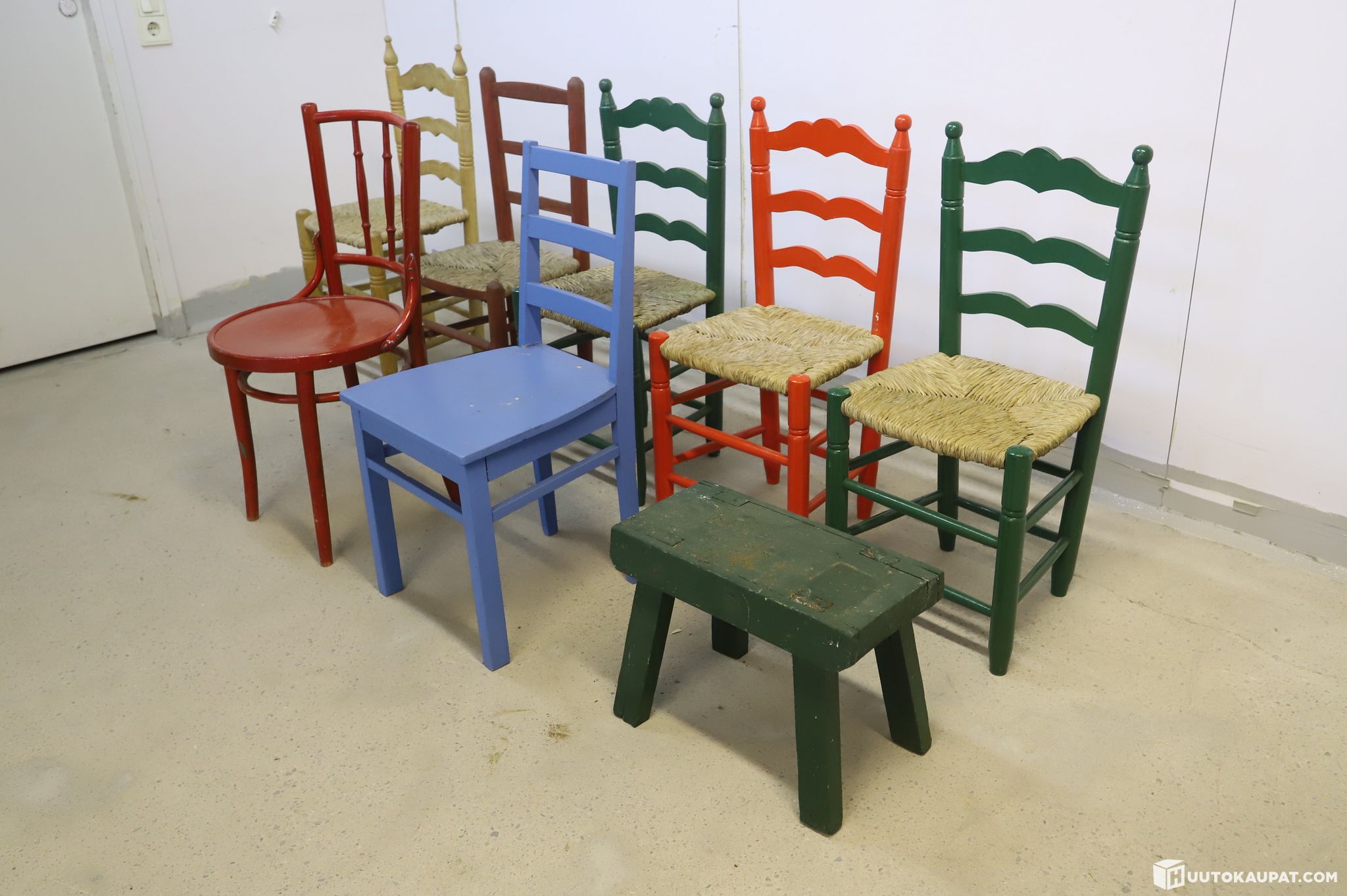 5 kpl perinteisiä, eri värisiä tikapuutuoja, joissa on kauniit meriheinäistuinpinnat.