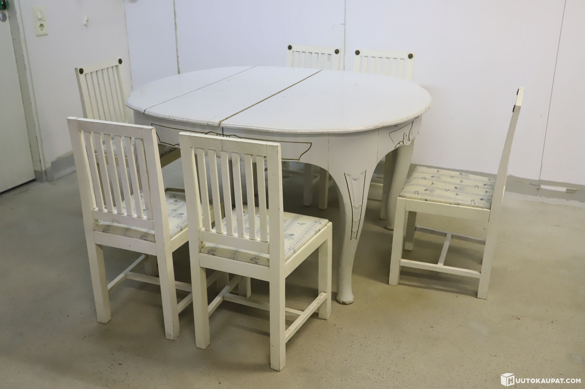 Myydään näyttävä ja tunnelmallinen vaalea ruokailuryhmä, jossa on kauniita yksityiskohtia ja ripaus vanhan ajan eleganssia. Setti sopii täydellisesti esimerkiksi perinteiseen keittiöön tai huvilalle.