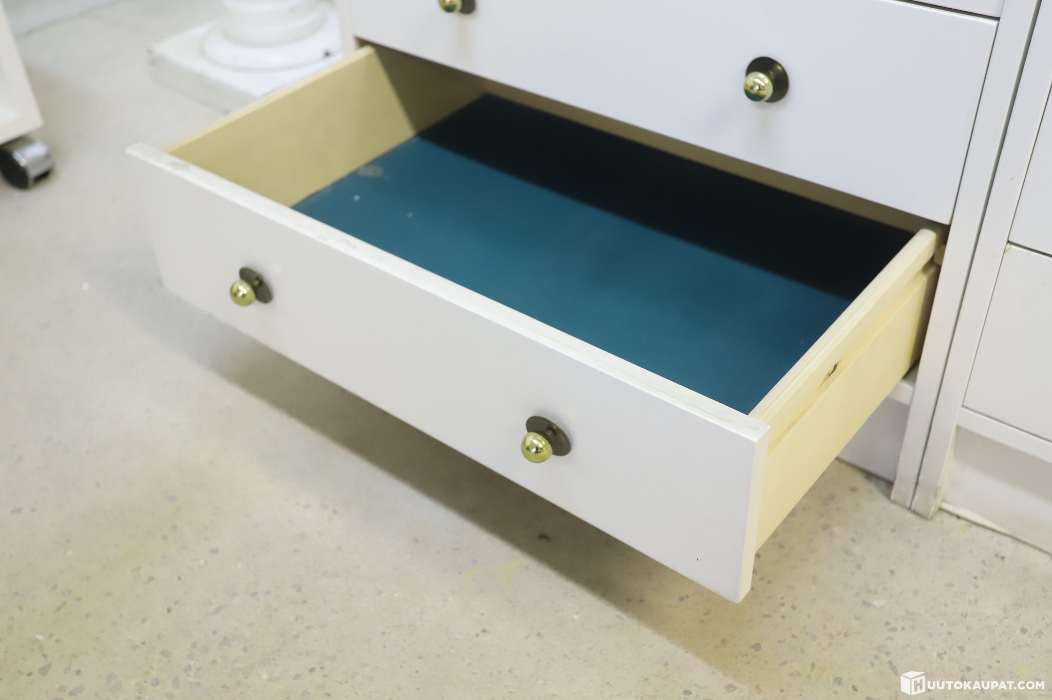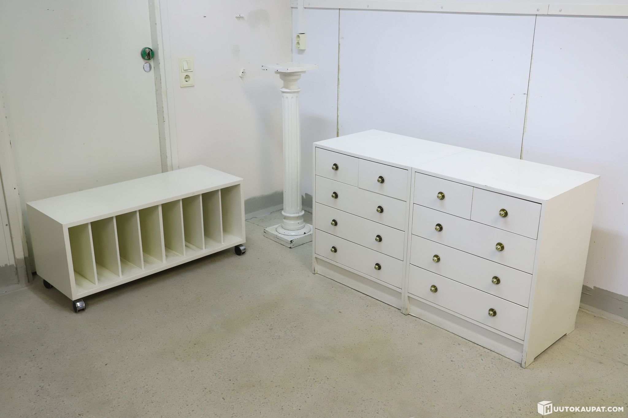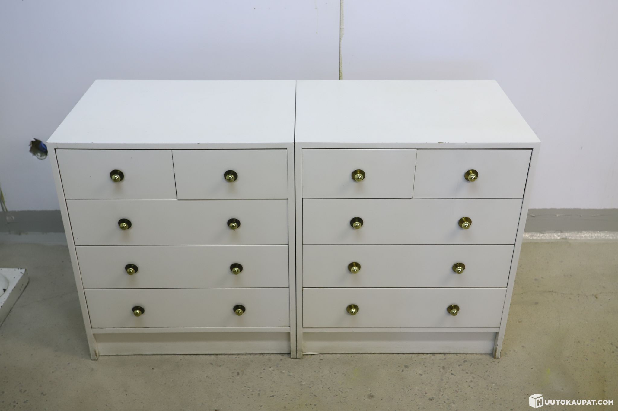 1. Kaksi valkoista lipastoa. Selkeälinjaiset lipastot, joissa on tyylikkäät messinkiset nuppivetimet. Runsaasti laatikkotilaa pientavaralle.