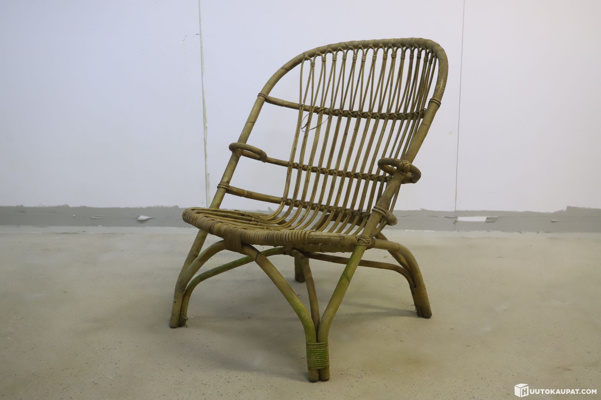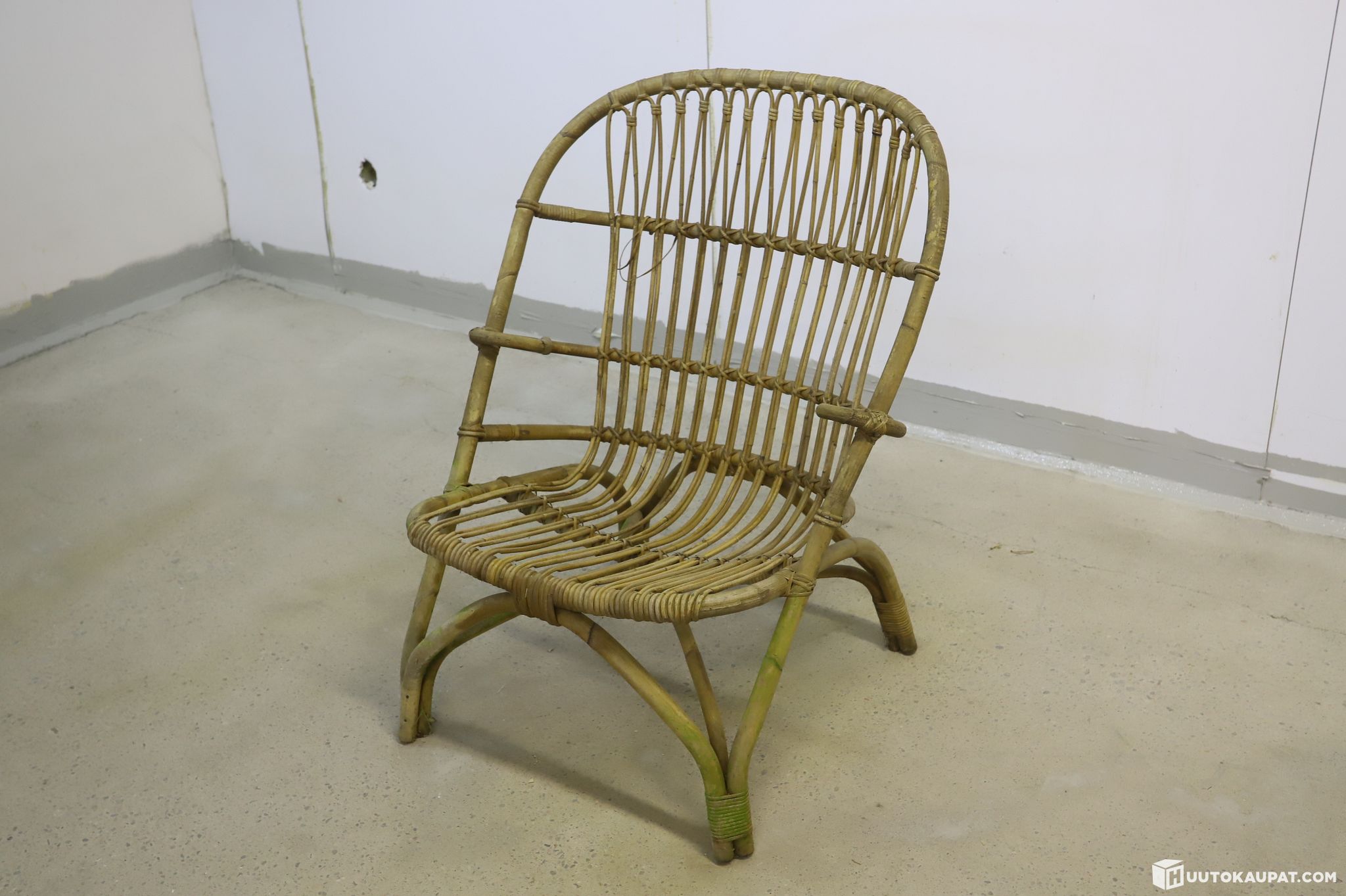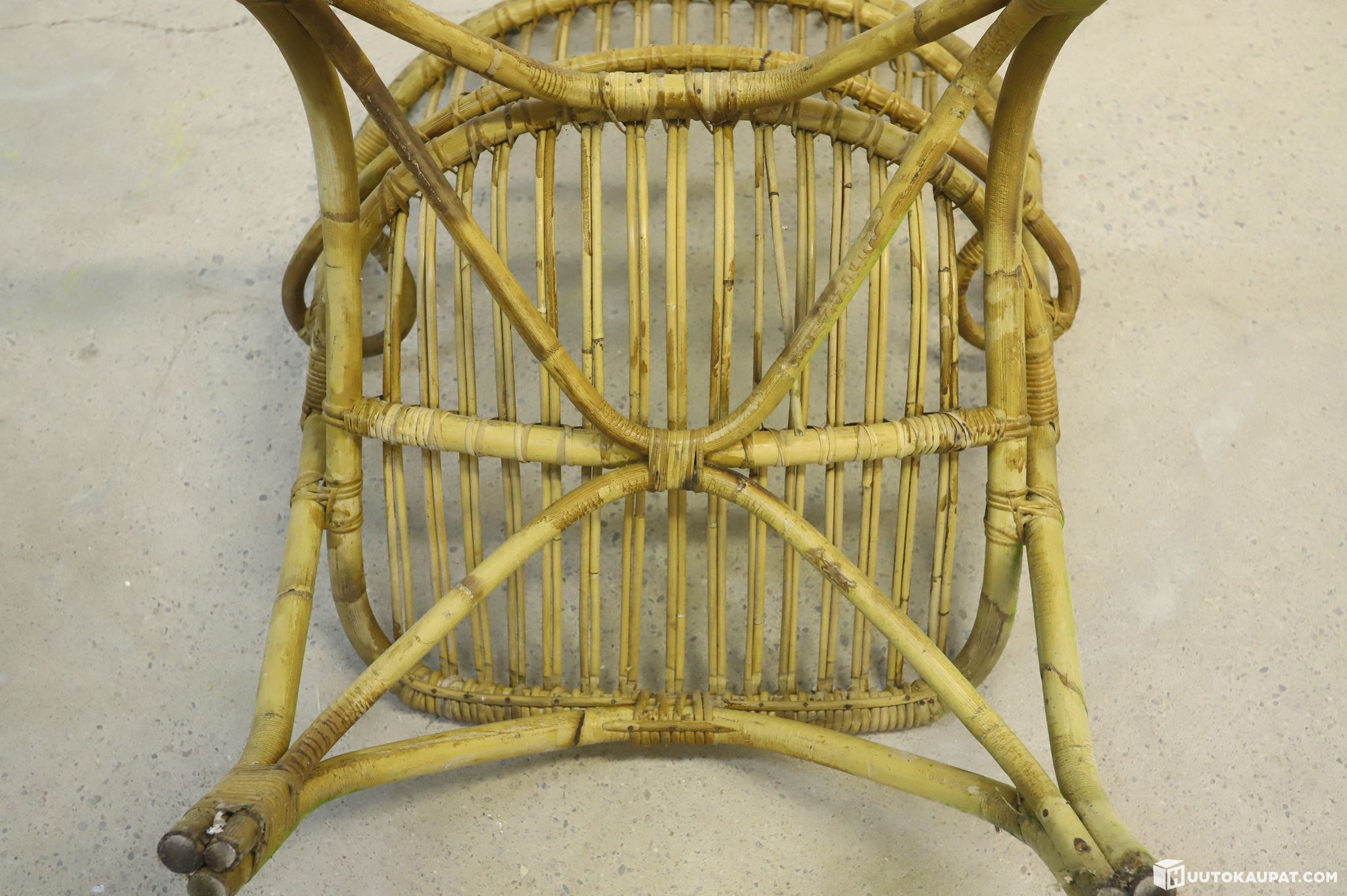 Tuoli on ikäisekseen siisti ja rakenteellisesti tukeva. Luonnonmateriaalille tyypillistä patinaa löytyy: selkänojan punoksessa on yksi katkennut nauha (ks. lähikuva) ja sidoskohdissa on hieman kulumaa, mutta nämä eivät vaikuta tuolin tukevuuteen tai käyttöön. Rottinki on säilyttänyt hyvin muotonsa.