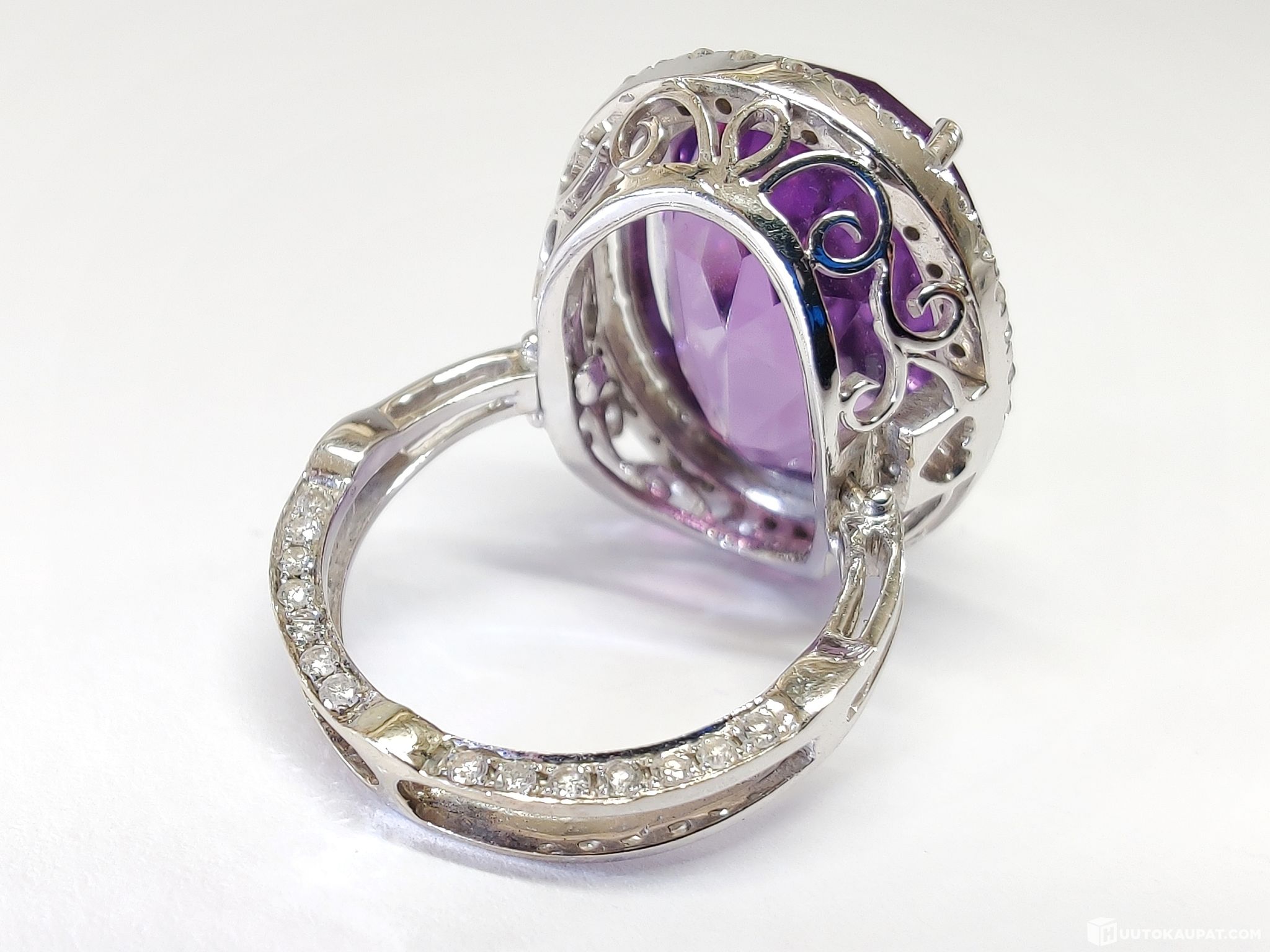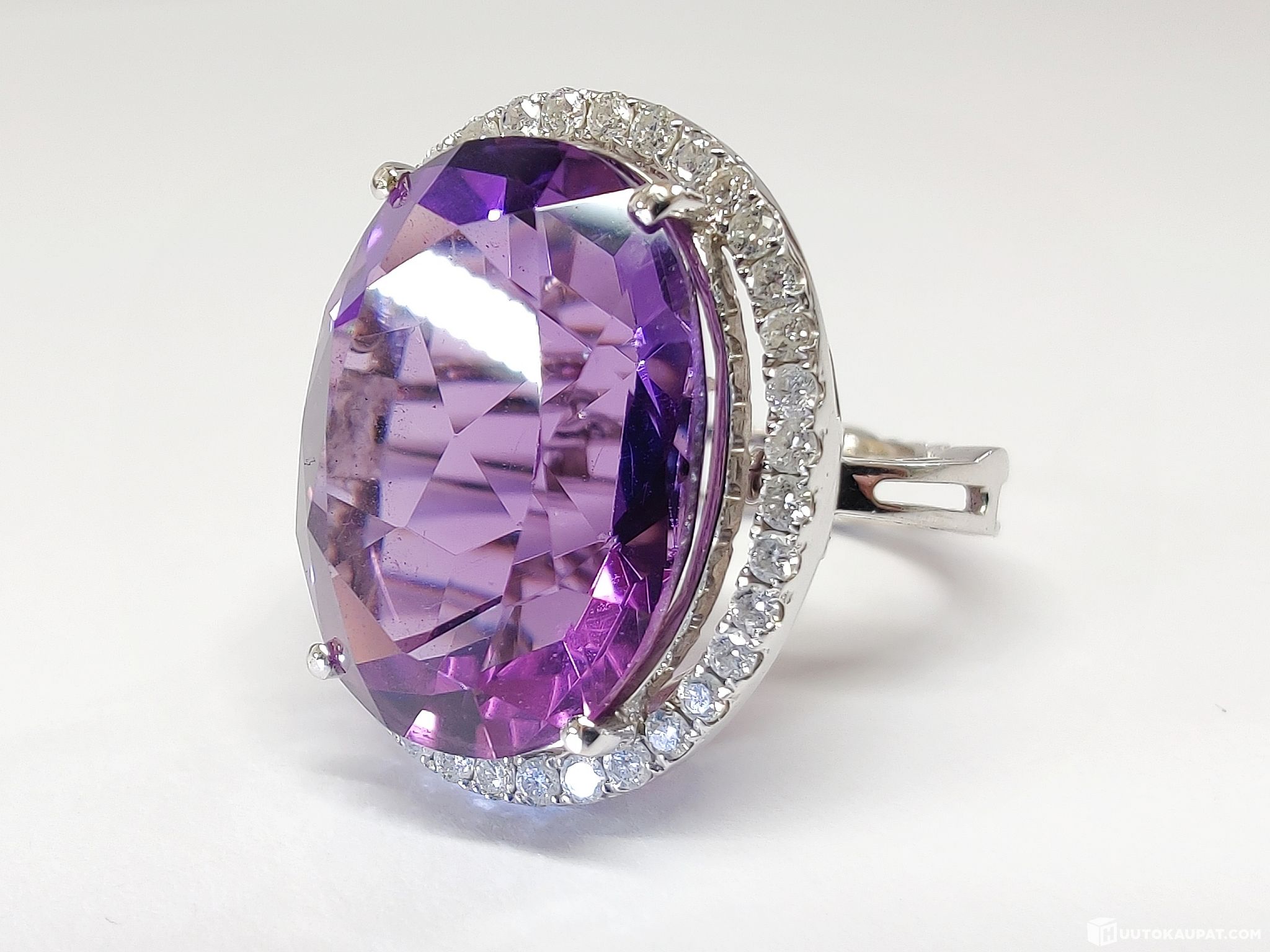 Hurmaavan kaunis 1,20 karaatin timantein koristeltu ametistisormus/-riipus 750 18k valkokultaa. Kotimaisen gemmologin arvio.