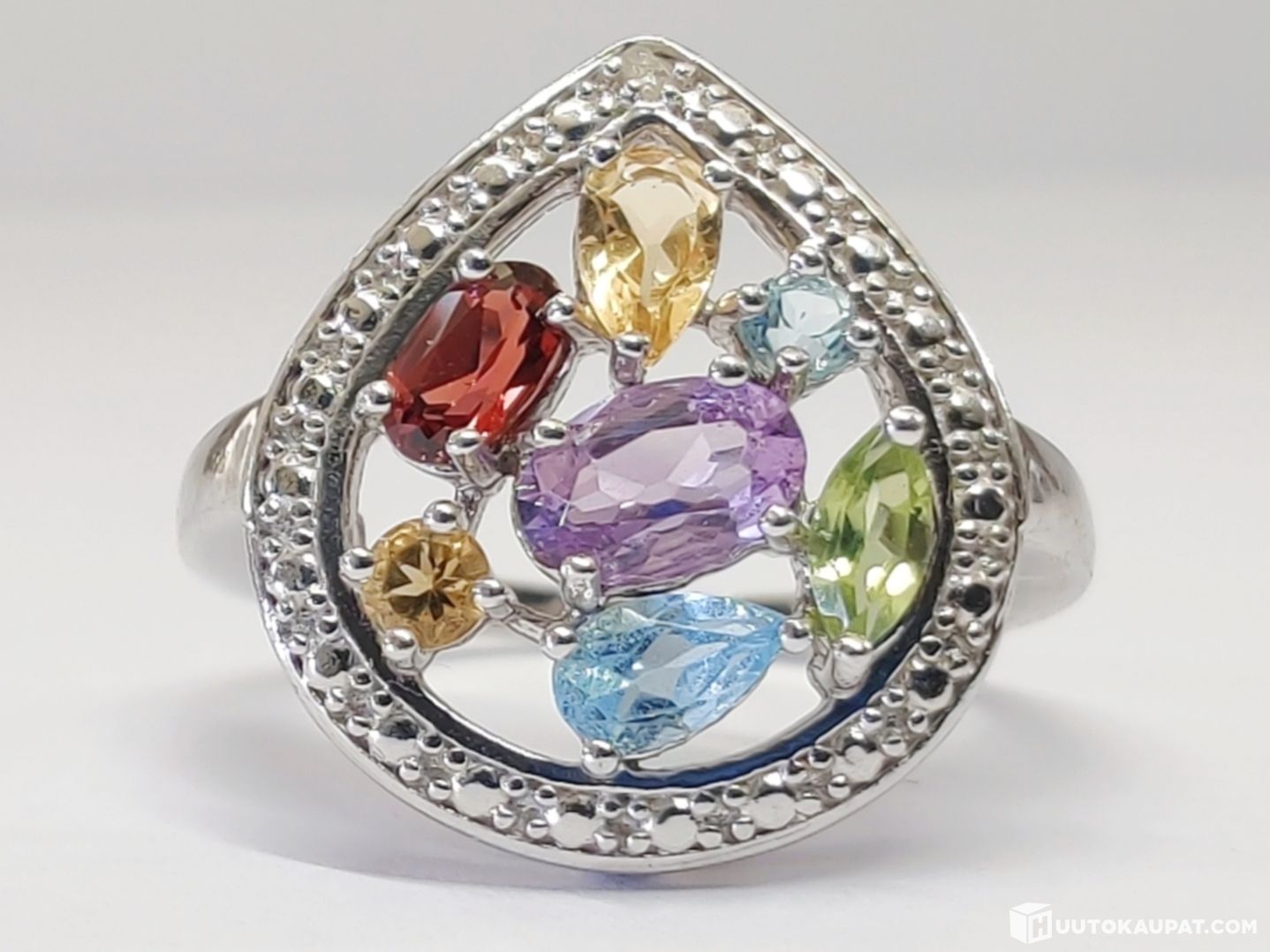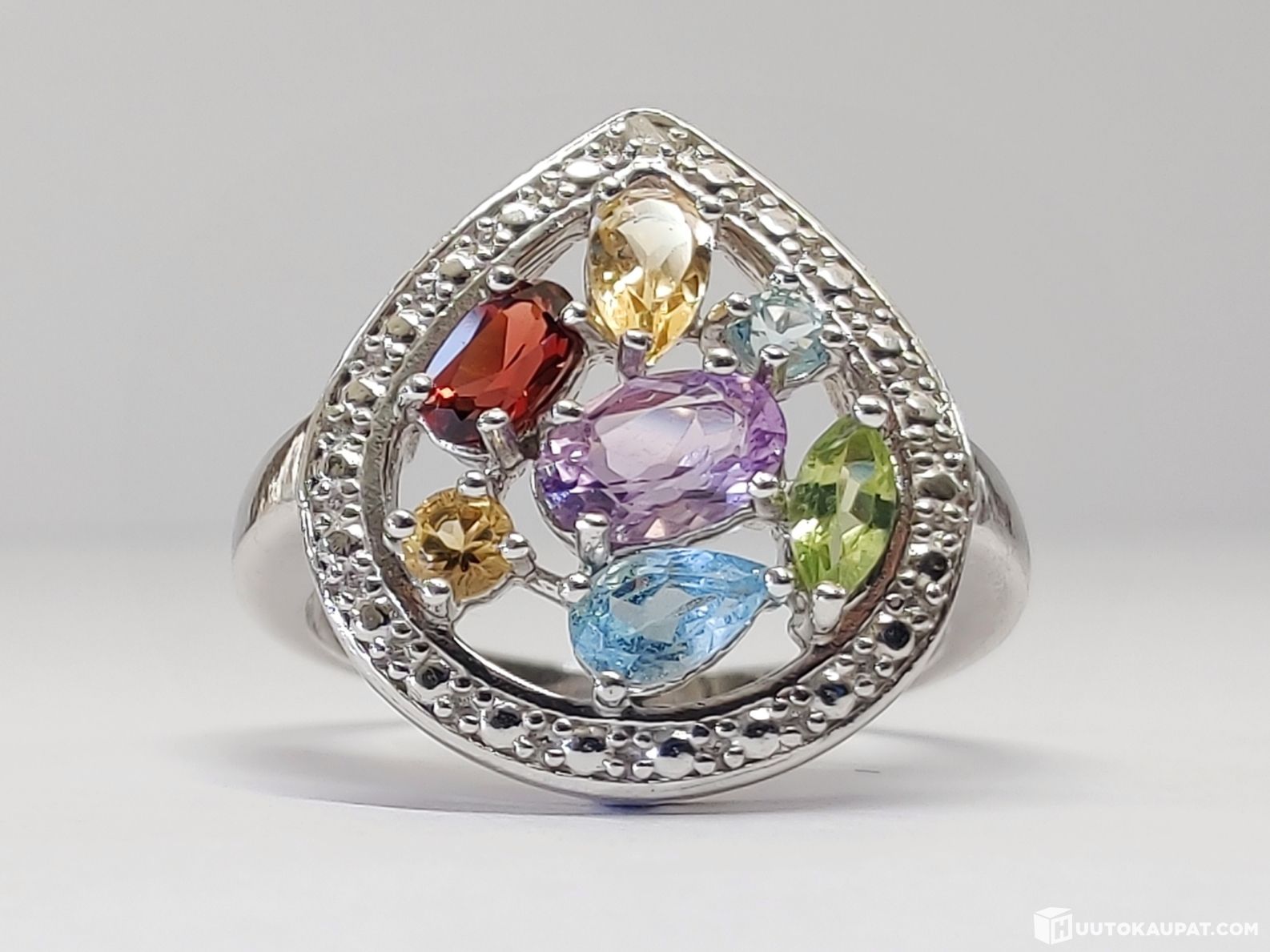 Todella kaunis sormus 925 hopeaa. Koristeena timantti sekä erilaisia puolijalokiviä.