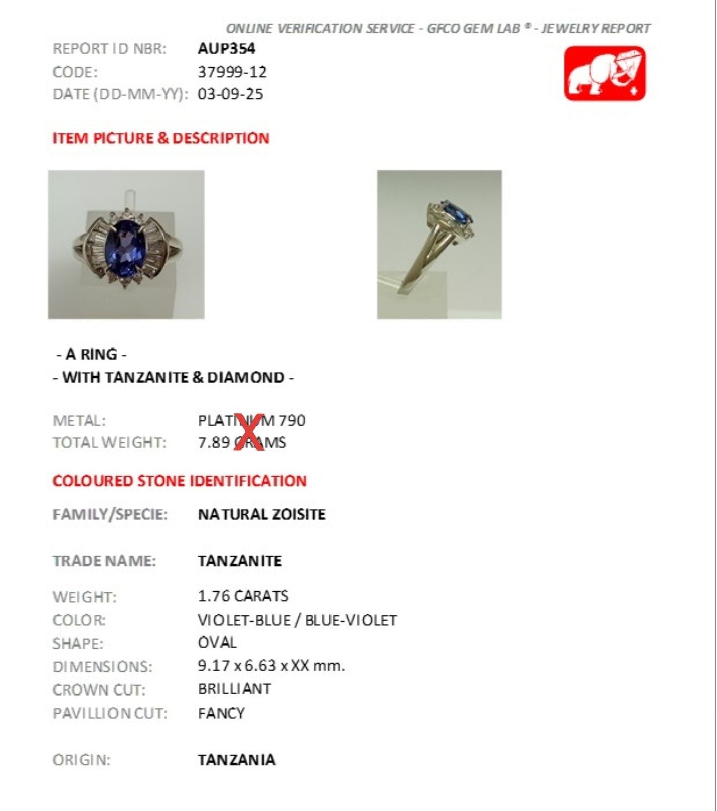 🟡 Sormuksesta on sähköisenä kaksi todistusta: Kansainvälisen gemologisen Instituutin (IGI) todistus rungosta ja timanteista, sekä sveitsiläisen GFCO-jalokivilaboratorion todistus tansaniitista. Eli tansaniitti on vaihdettu runkoon toisesta sormuksesta safiirin tilalle, jonka päälle kuvassa vedetty X.
