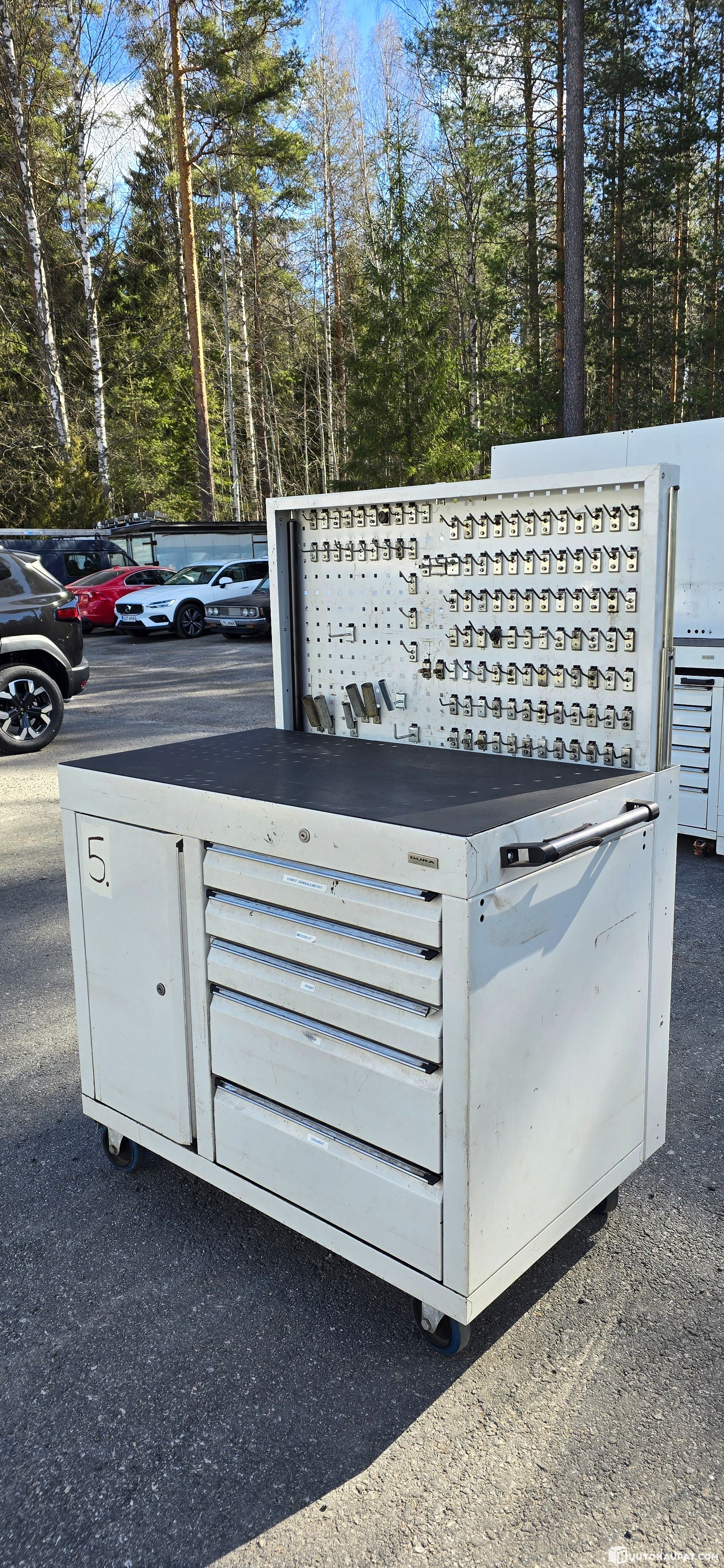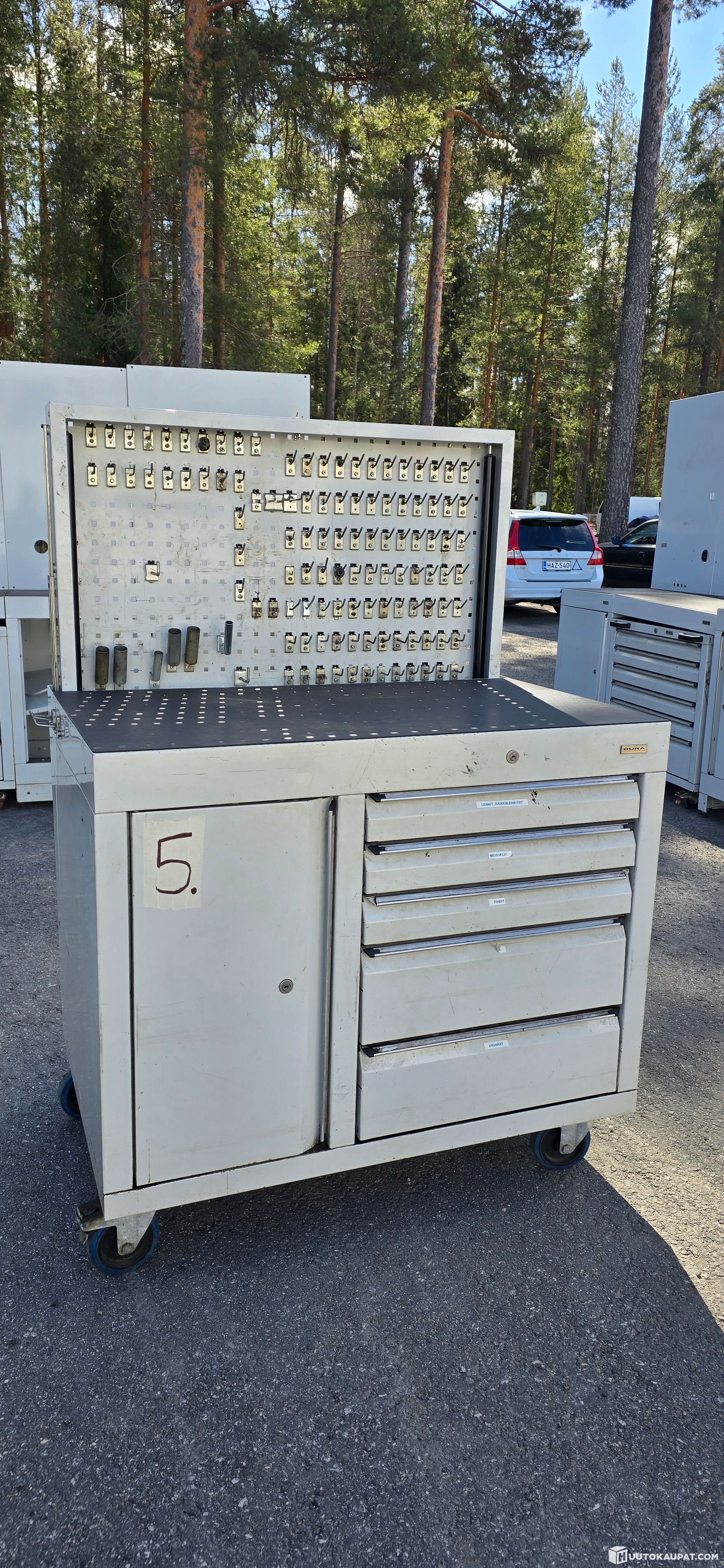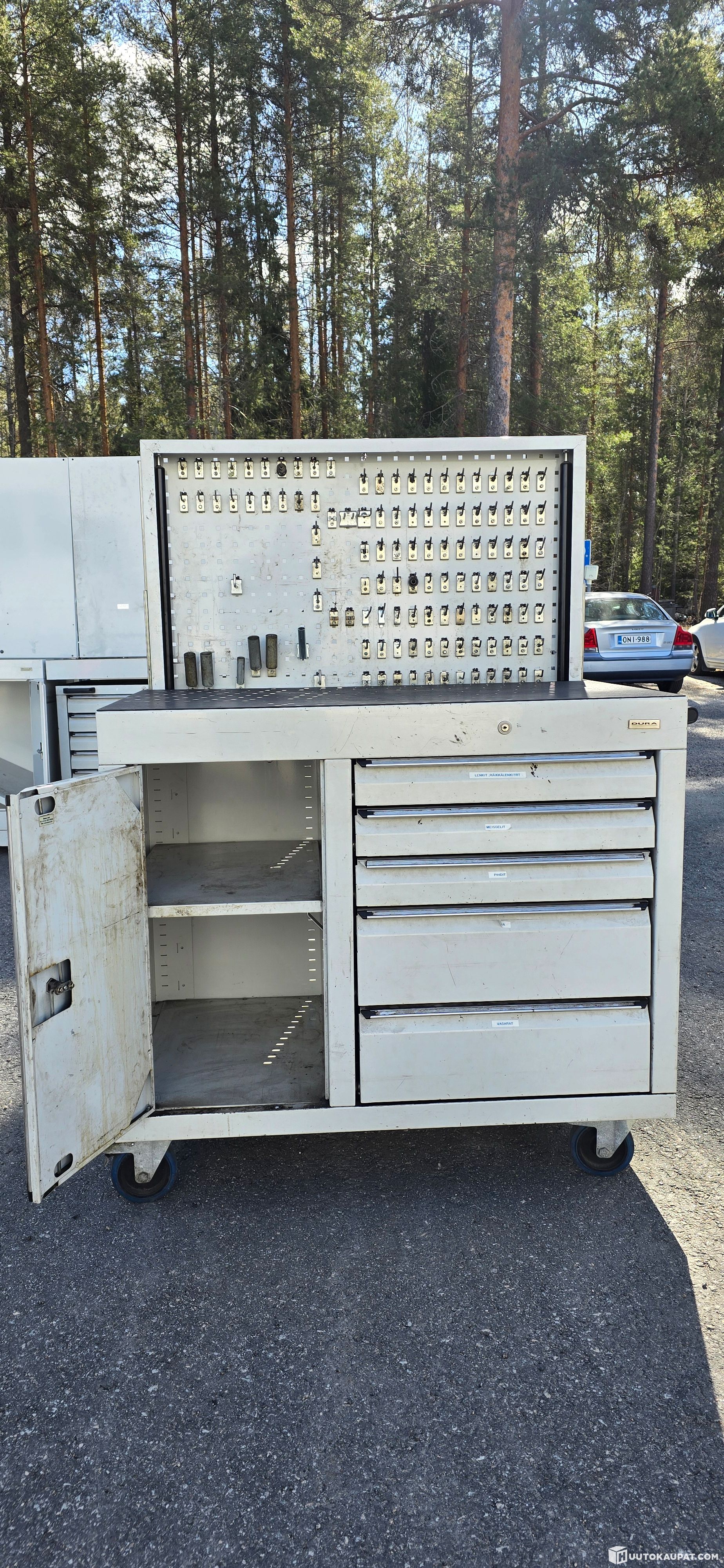 Iso, jämäkkä ja laadukas työkaluvaunu vetolaatikoilla, kaapilla ja työkaluseinällä. Mitat: P110XL70XK150 cm. Käytön jälkeä ja kulumaa on.