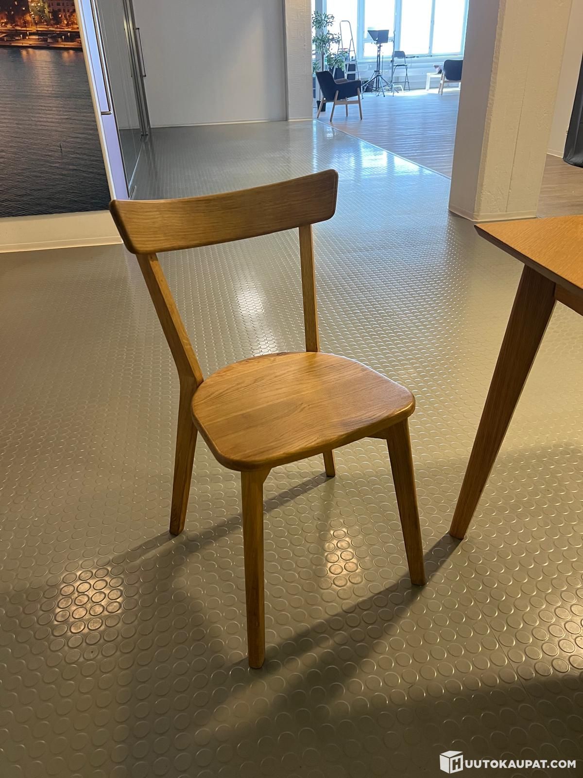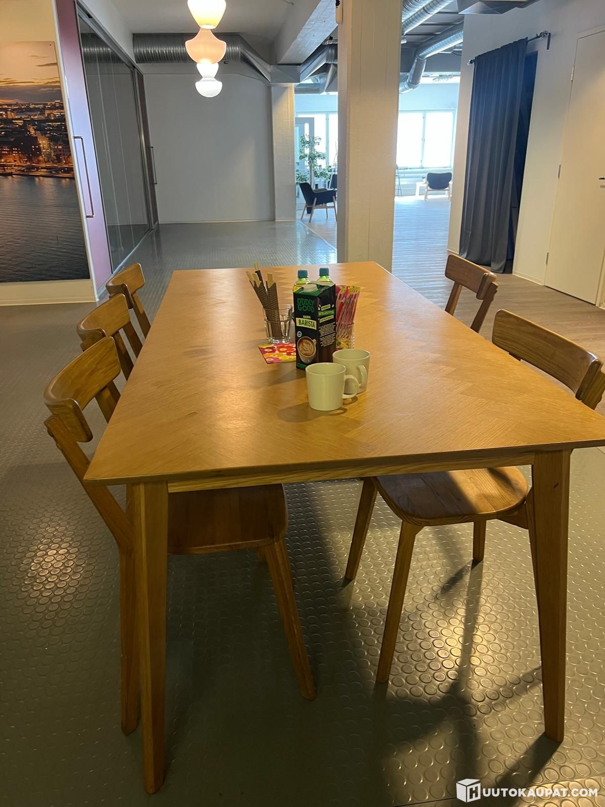Huutokaupataan toimistokäytössä ollut ruokapöytä. Pöytä n. 3 vuotta sitten ostettu uutena Maskusta. Tuoleja on 5. Tuolit ovat vähän huterat. Ratkeaa varmasti kiristämällä ruuvit / liimaamalla. Pitää noutaa 28.4. klo 9-14 välillä.