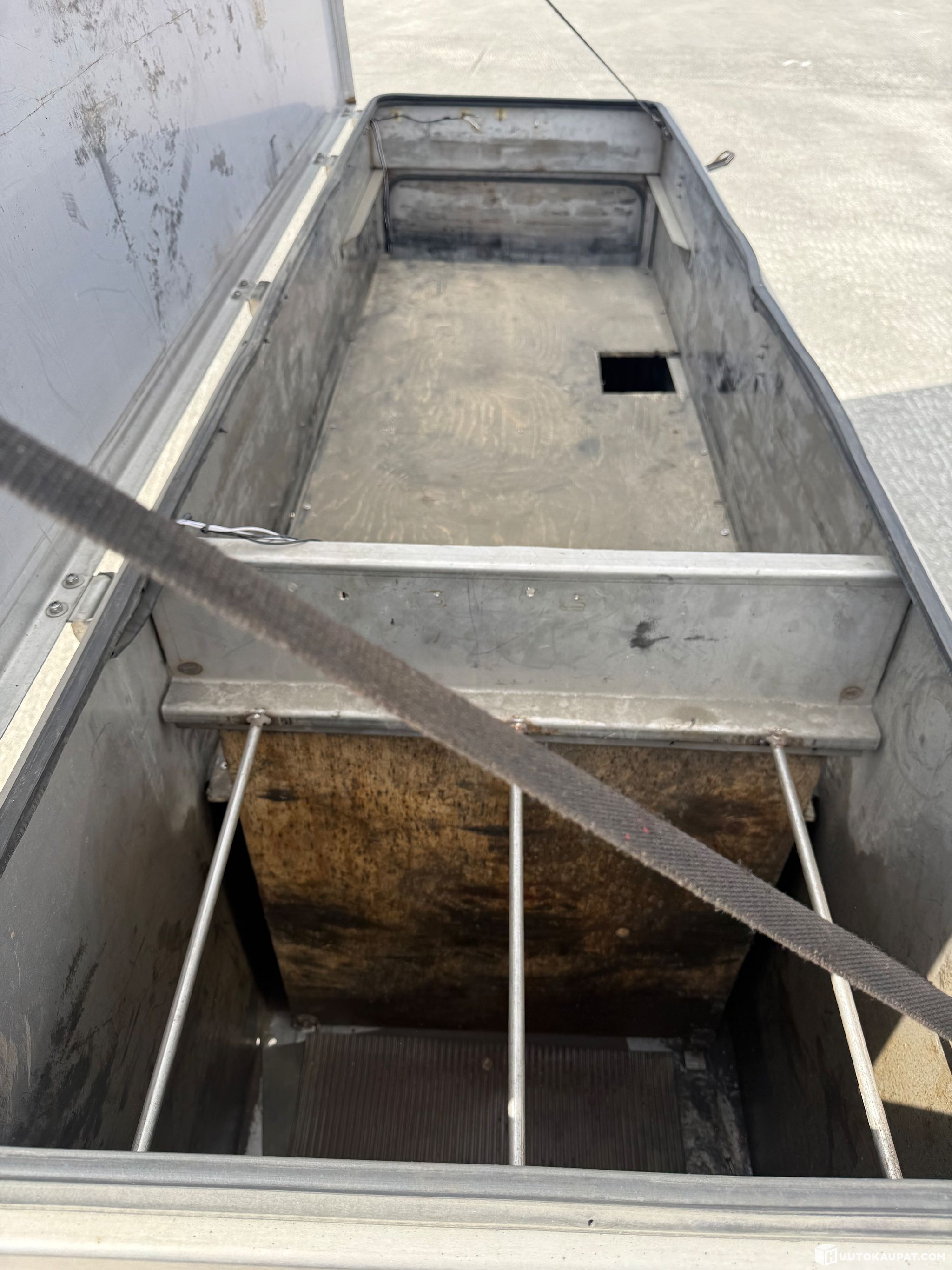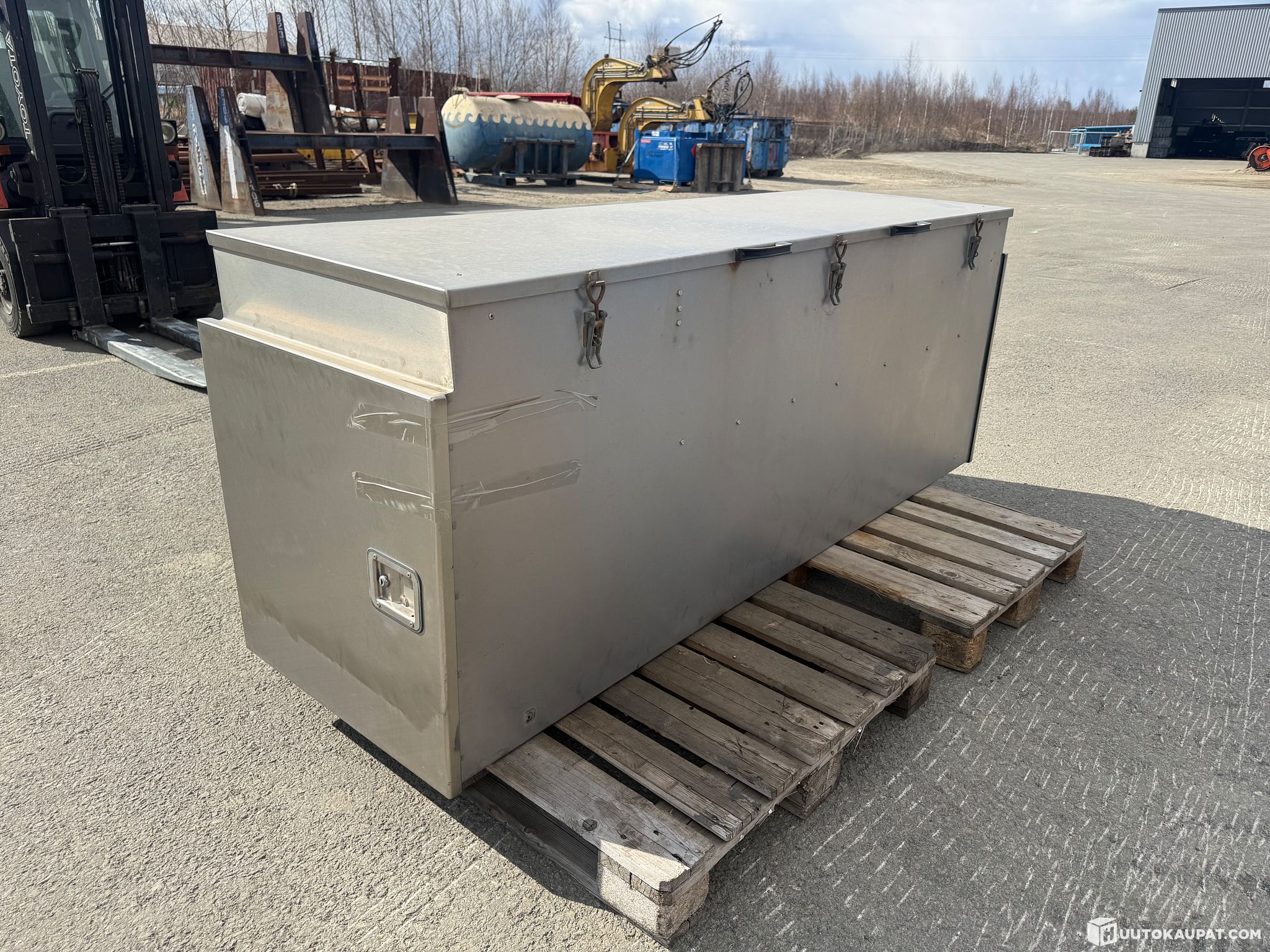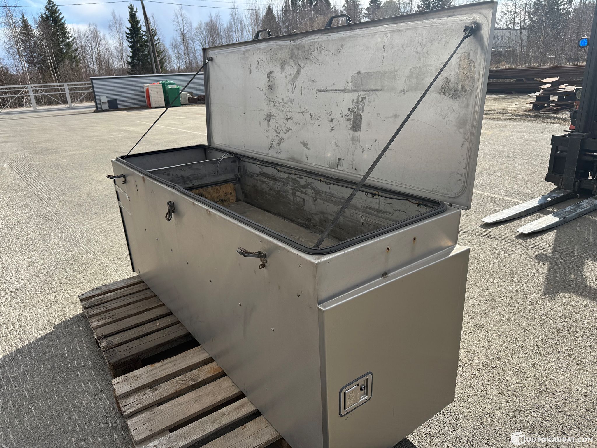Iso rosterinen varustelaatikko lavetinveturista ketttingeille, liinoille, työkaluille ym. Ovet päädyissä ja iso lunkka päällä. Toinen ovenlukko on rikki.