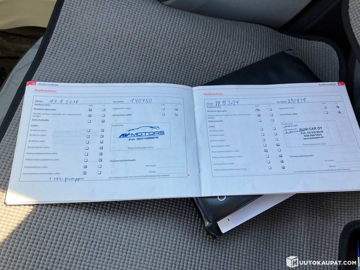 Huollot kuvissa (Viimeisin merkintä kirjassa 28.11.2024 290tkm kohdalla)