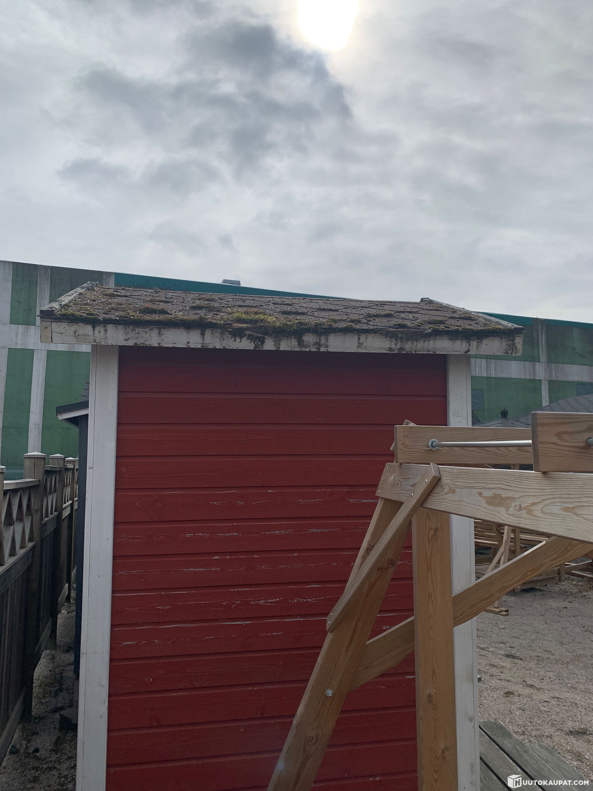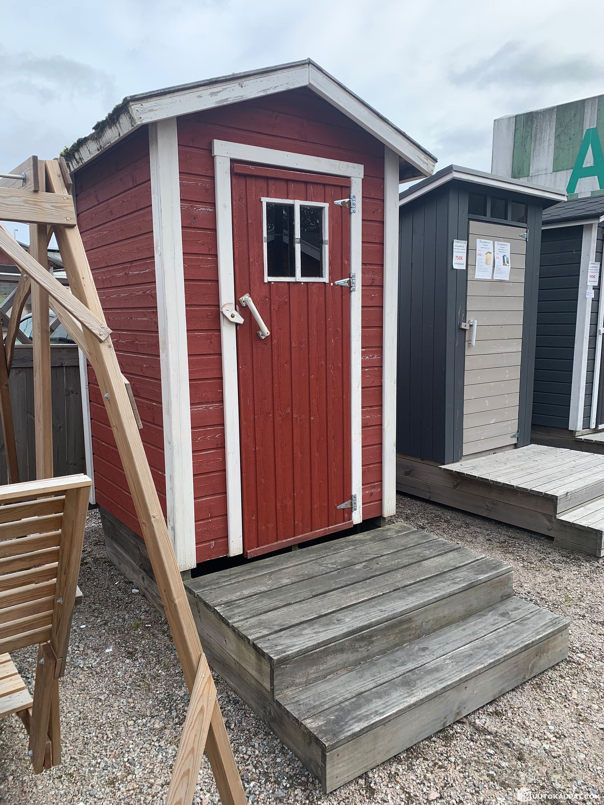 Muutamia vuosia pihakaluste myymälän näyttelyssä ollut käymälä, korokepala, Biolan Eco kompostikäymälä. Katon reuna nähnyt parhaat päivänsä. Valmistettu kotimaisesta havupuusta.