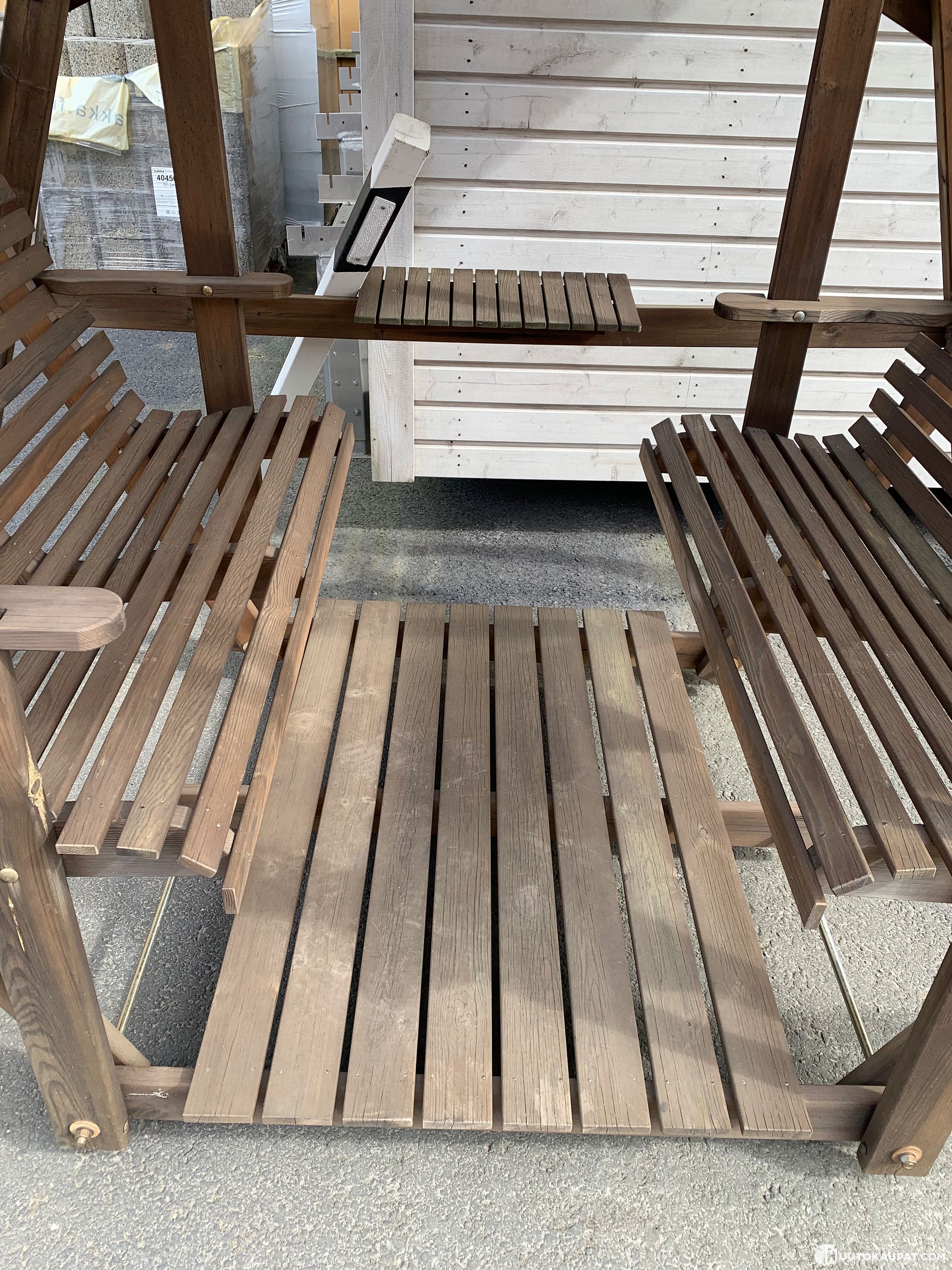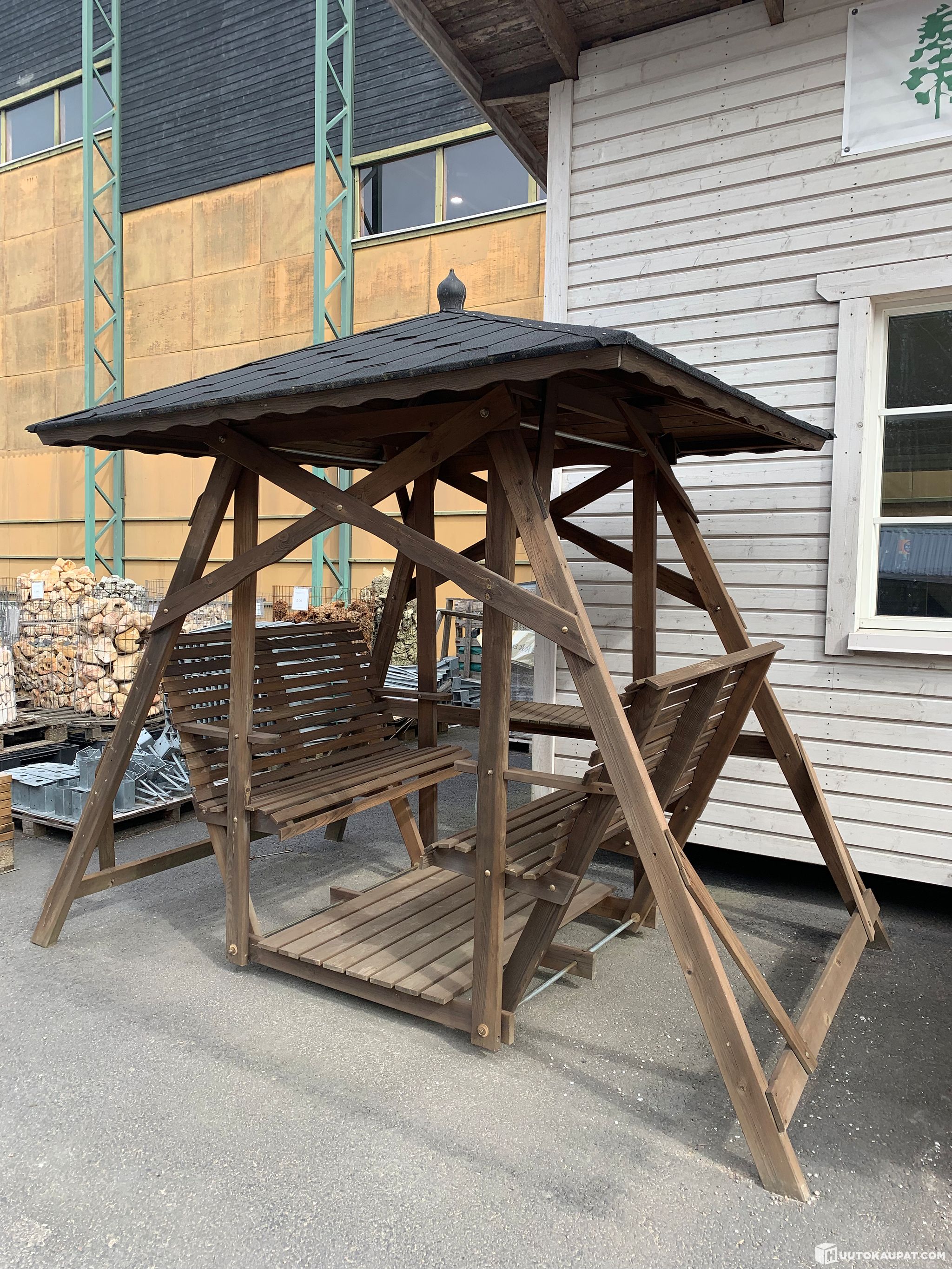 Muutaman vuoden pihakalustenäytelyssä Hinnerjoella ollut keinu katolla. Keinu valmistettu kotimaisesta ruskeaksi painekyllästetystä männystä. Tukeva taloyhtiöiden suosima perinnekeinu.