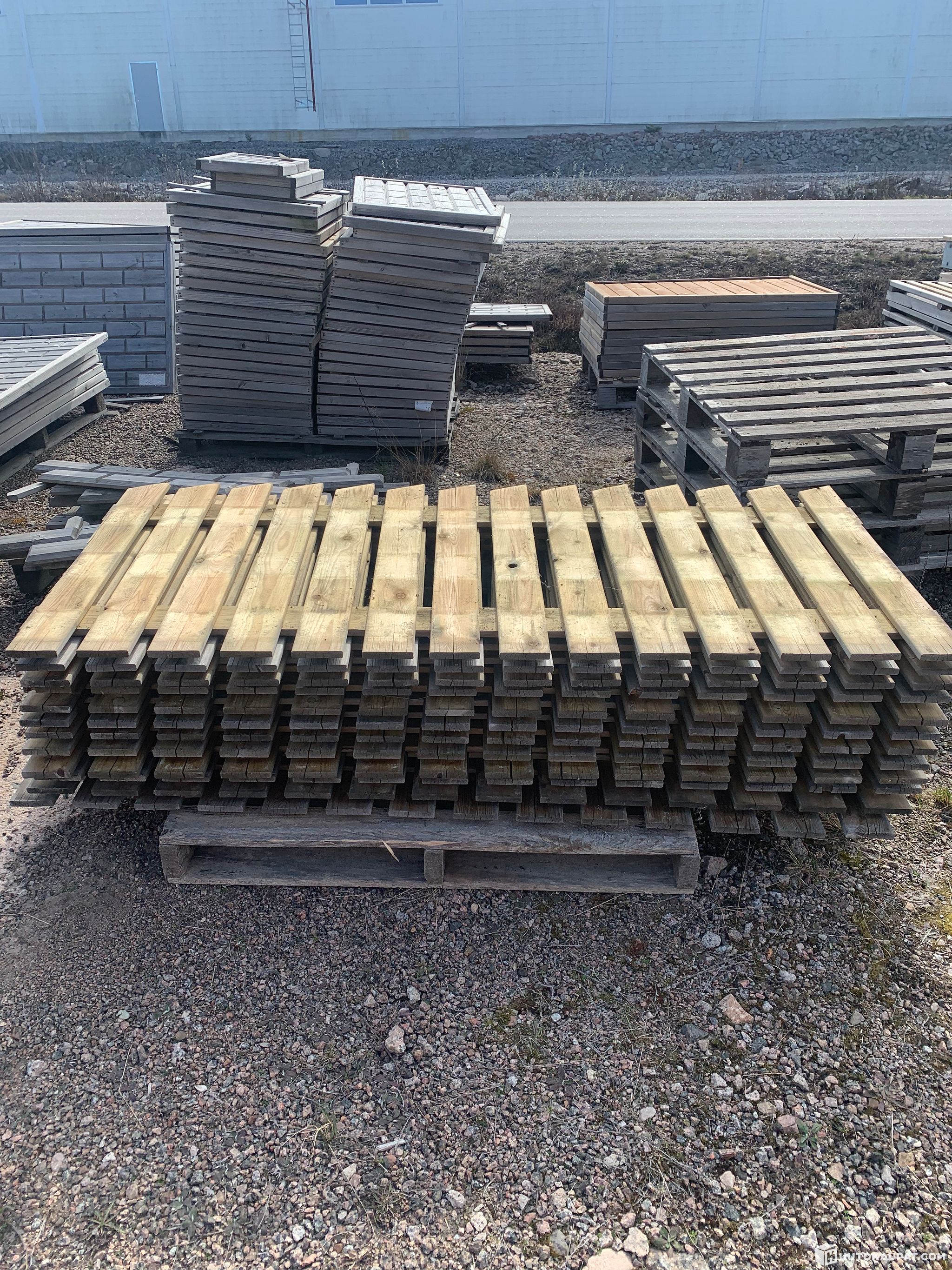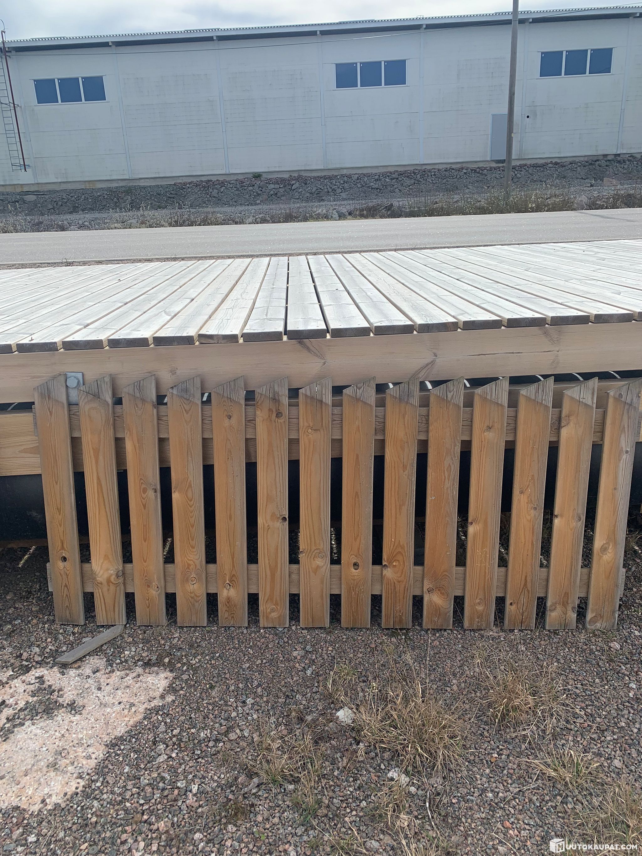 Muutamia vuosia myymälän pihalla olleet aidat. Aidoissa väri eroja ja harmaantumaa, rakenteellisesti ehjiä. Valmistettu vihreäksi painekyllästetystä männystä.
