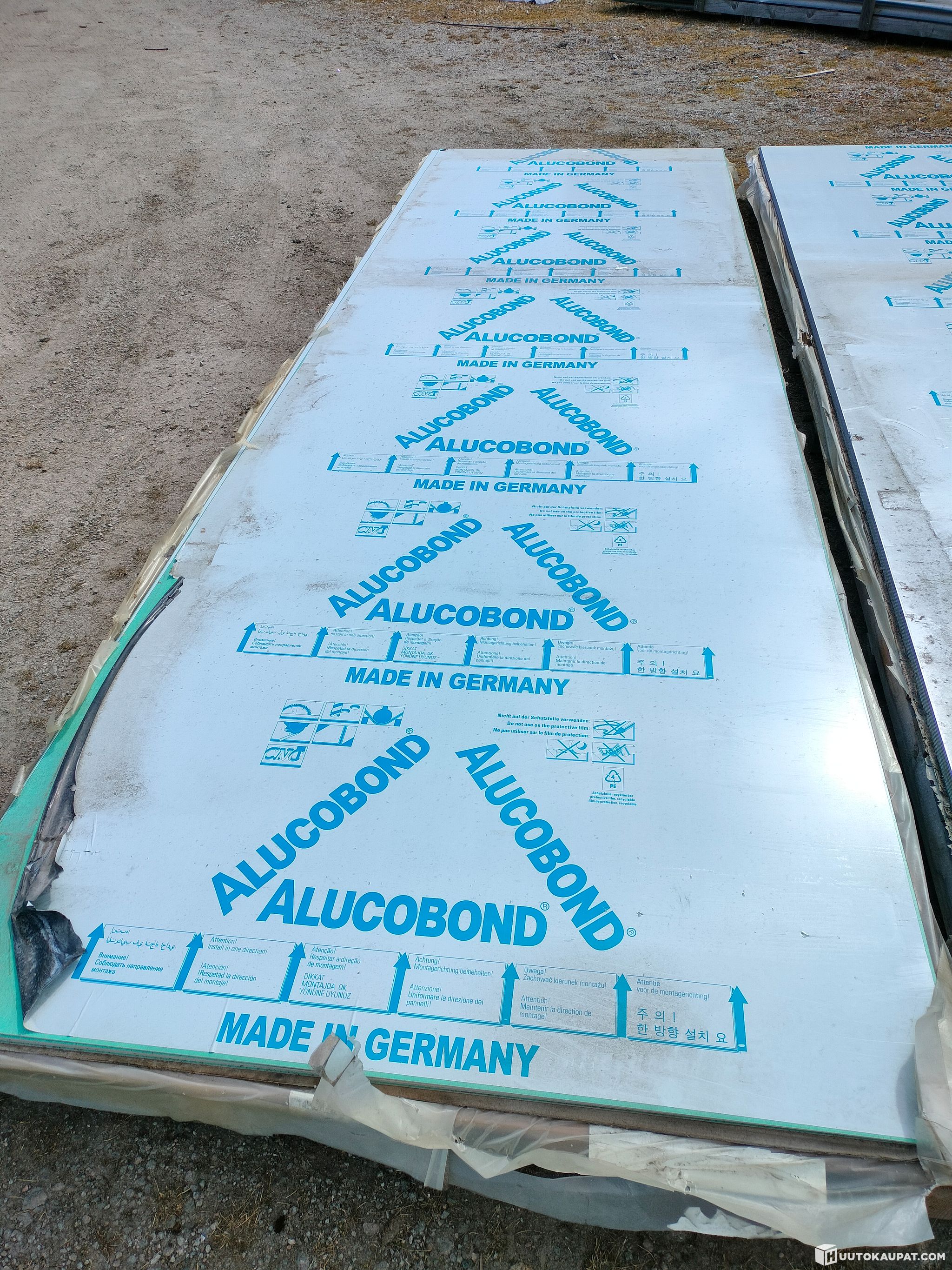 Ylijäämää. Noin 5000mmx1500mm alumiinikomposiittilevyjä. Turkoosi/vihertävä jossa täpliä. 6kpl. Säilytetty ulkona. Pinnassa saattaa olla naarmuja, painaumia, vääntymiä ym.