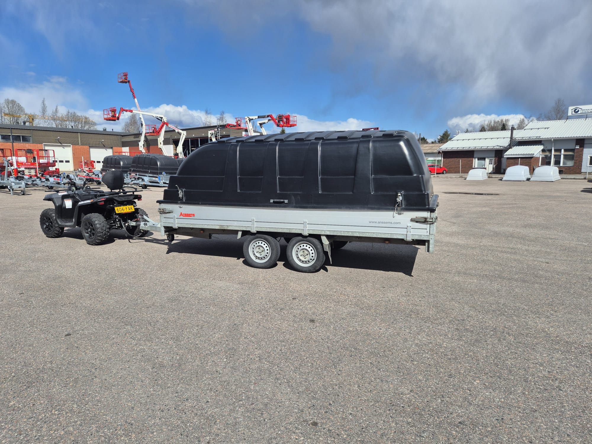 Uusi 01 luokan 1-akselinen jarruton peräkärry ilman kuomua hinta, myös kuomu ja pääkuvassa oleva moottorilla nokka pyörä lisähinnalla., Somero